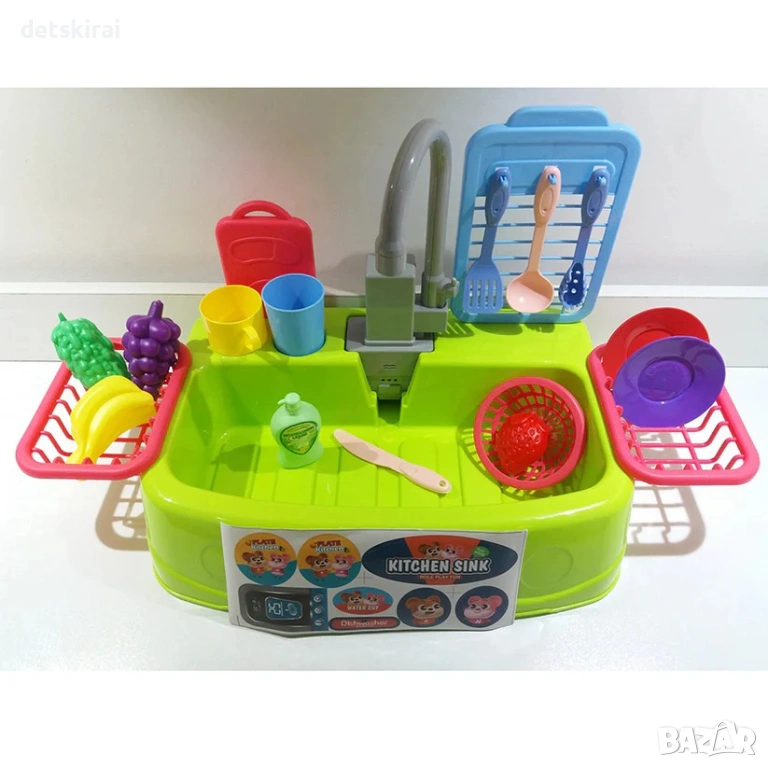 Играчката разполага с електрически кран с циркулация на водата, който позволява реалистична симулация на измиване на съдове. Водата се изпомпва и циркулира автоматично, без излишно разхищение. Кранът може да се завърта на 90°, което прави играта още по-реалистична и удобна. По този начин децата разбират по-добре семейните задължения и изграждат практични навици чрез игра.