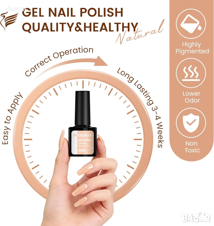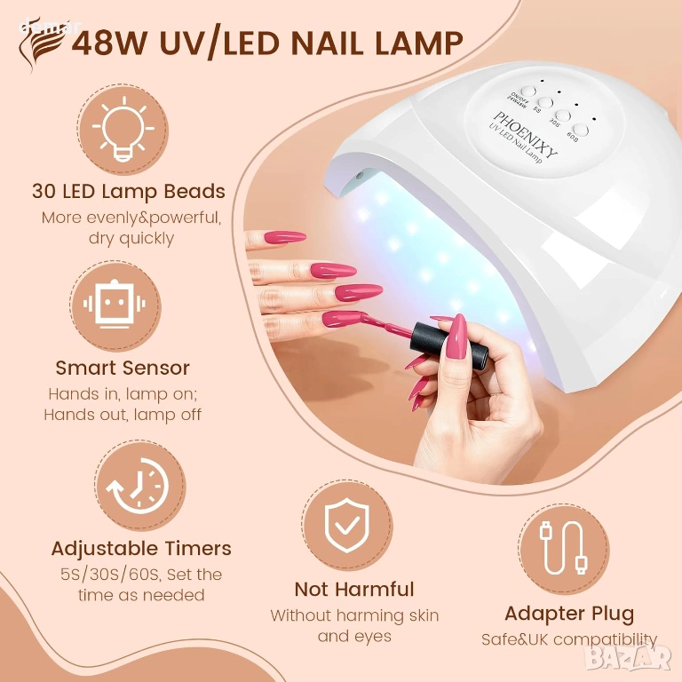Пълен комплект за гел лакове, предназначен за домашна и студио употреба, включващ 35 богато пигментирани цвята гел лакове в бутилки от 7 мл, заедно с пет основни вида покритие, включително базово, гланцово, матово, брокатено и златисто топ покритие за разнообразни визии в ноктопластиката. Комплектът включва и мощна 48W UV/LED лампа с три настройки на таймера и интелигентна технология за автоматично разпознаване, подходяща за втвърдяване на всички видове гел без ограничения за марките, което прави нанасянето ефективно и удобно. С широкия си избор от нюанси и множество опции за покритие, този комплект за маникюр „всичко в едно“ осигурява всичко необходимо за създаване на професионално изглеждащи резултати, а също така служи като добър избор за подарък за поводи като рождени дни, Ден на майката, Свети Валентин, Коледа или годишнини.