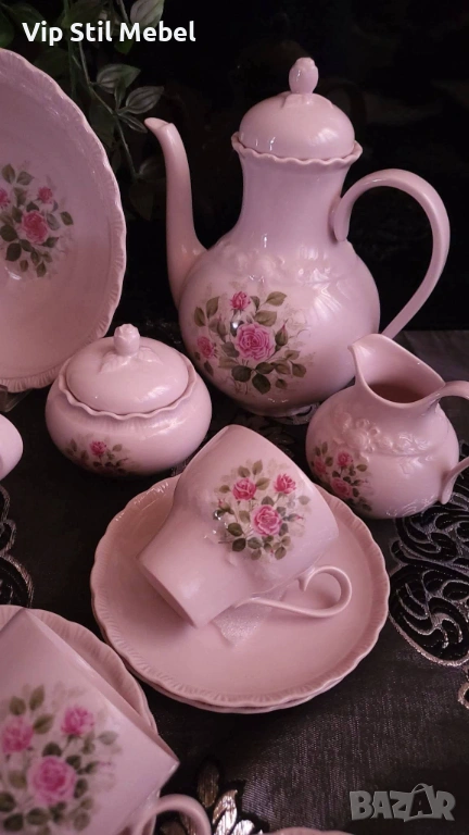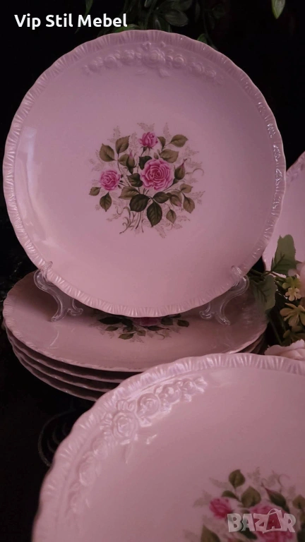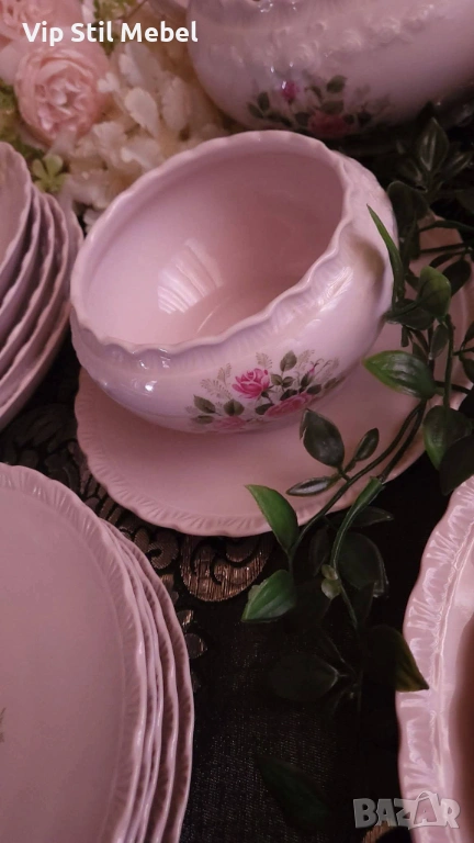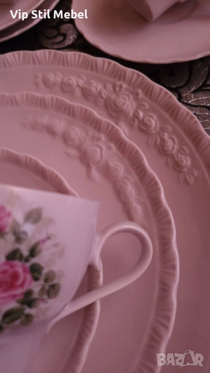 Розов порцелан с флорален декор от рози, оребрен кант и релефни рози по борда.