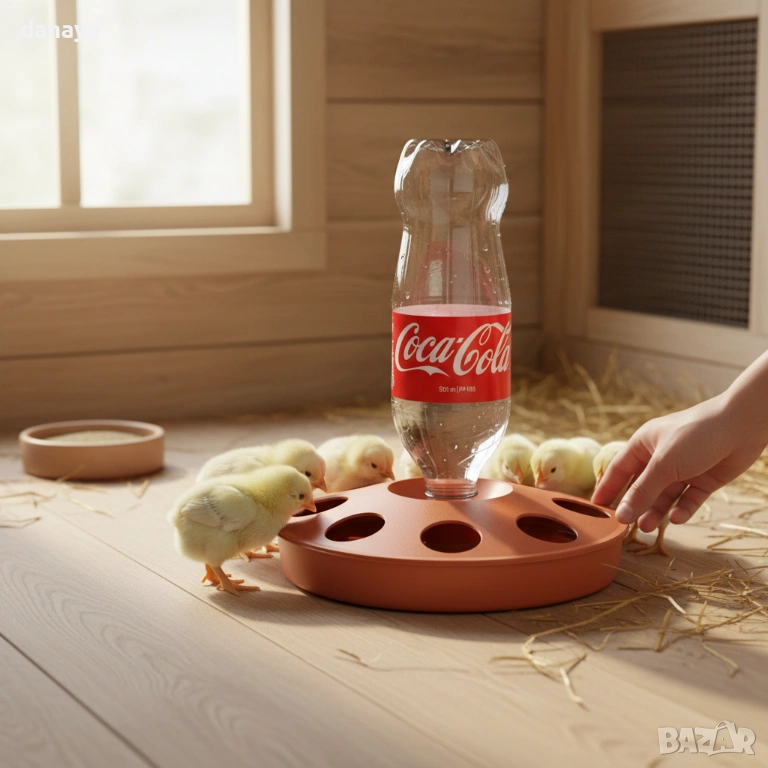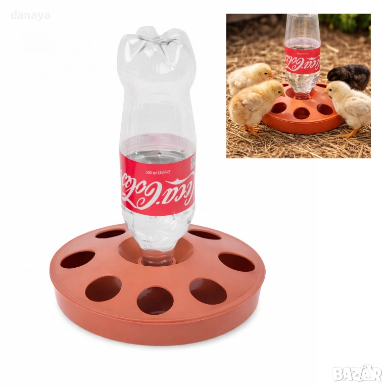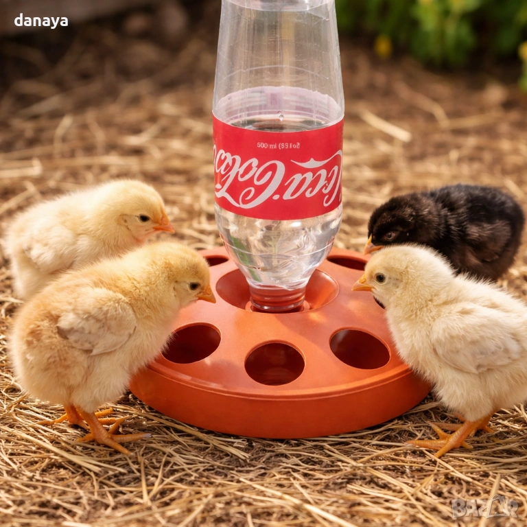 Поилка за пилета за бутилка е практично и икономично решение за осигуряване на постоянен достъп до вода за малки пилета и пиленца. Тази поилка за шише позволява използването на стандартна пластмасова бутилка, която се навива директно в основата и служи като резервоар за вода.