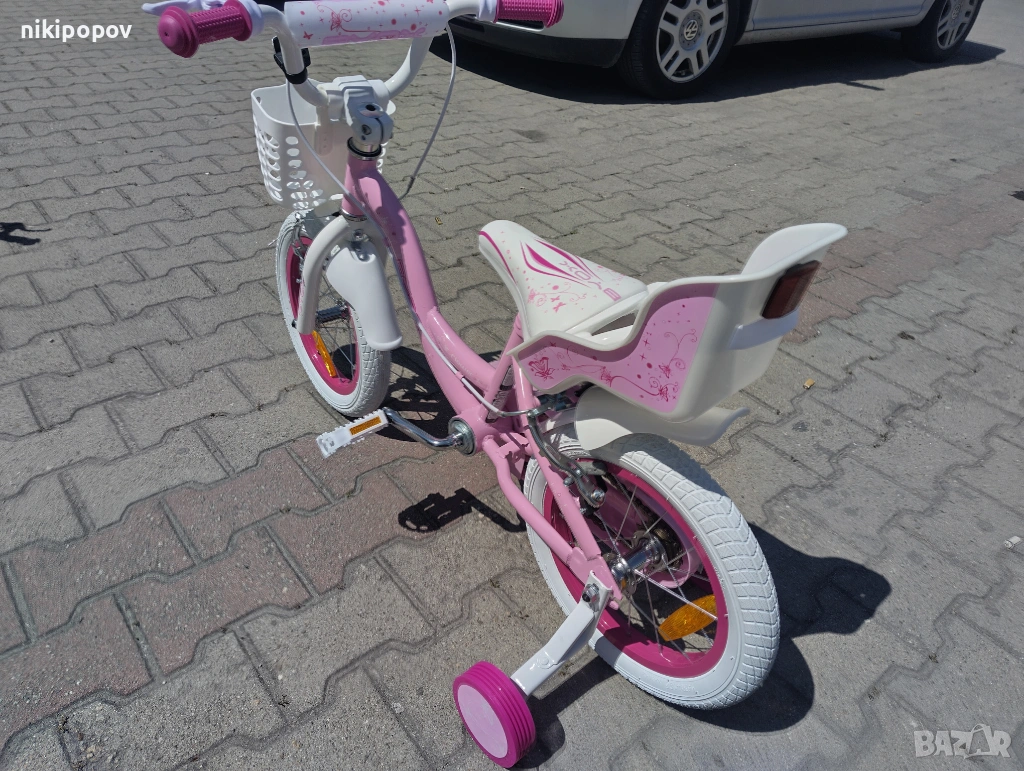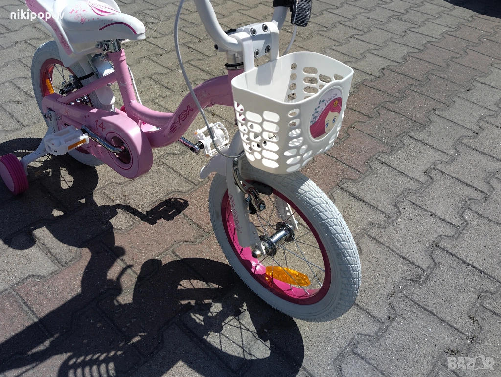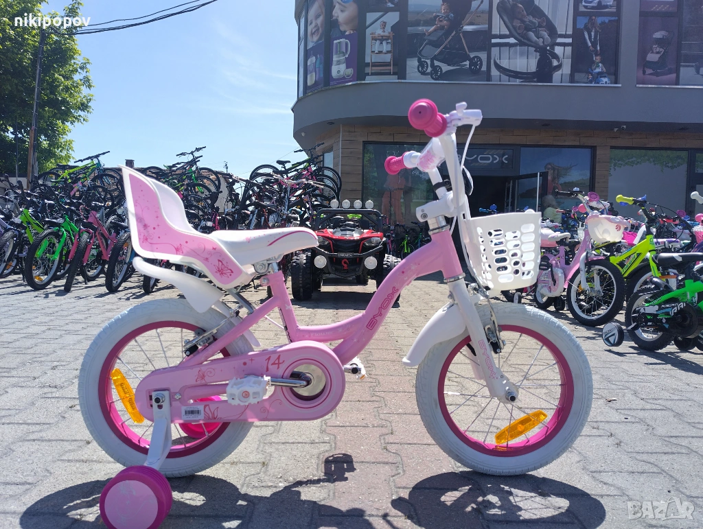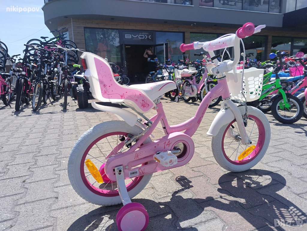 - Детският велосипед с марка Byox модел 14" Flower е е един прекрасен избор за децата между 3 и 5-годишна възраст и височина от 90 до 110см. Рамката е метална. Велосипедът е с алуминиеви капли и алуминиев държач на кормилото. Разполага с предна и задна V-brake спирачка, пластмасови калници и предпазител на веригата.