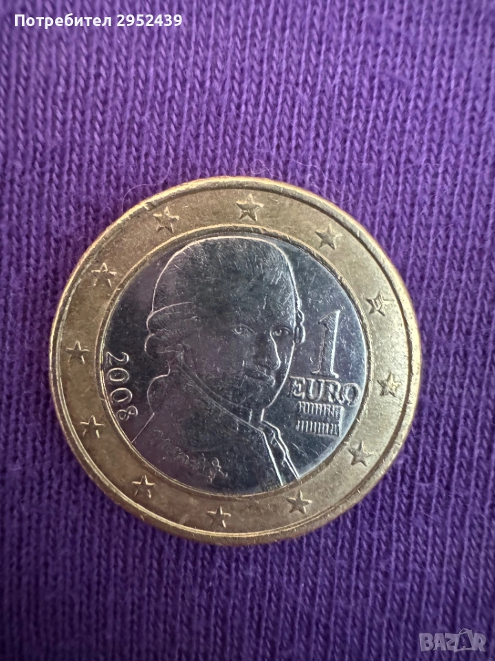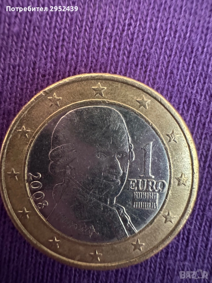 Монета от 1 евро,австрийска от 2008година,на нея е изобразен композитора Волфганг Амадеус Моцарт ,дело на художника Йозеф Кайзер