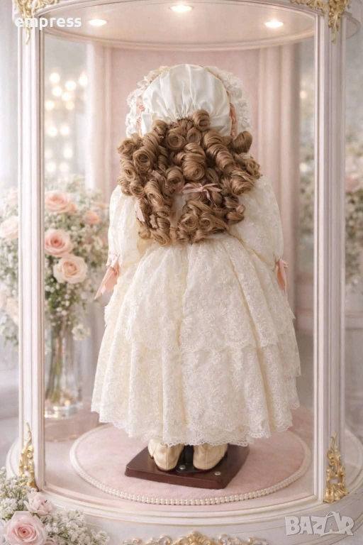Fleur е облечена в романтична рокля в нежен кремав тон с фини бродерии, богата дантела и сатенен колан, който подчертава деликатната ѝ визия. Порцелановото ѝ лице е с нежно изрисувани черти и меко излъчване, а внимателно оформените къдрици допълват класическата ѝ елегантност. Sophie от своя страна впечатлява с изискан ансамбъл в топли бежови нюанси, съчетаващ дантелени акценти, фин текстил и ефирни пера, които придават аристократично и изключително стилно присъствие. Всяка тъкан, всеки шев и декоративен елемент са изпълнени с характерния за Alberon финес и внимание към детайла.