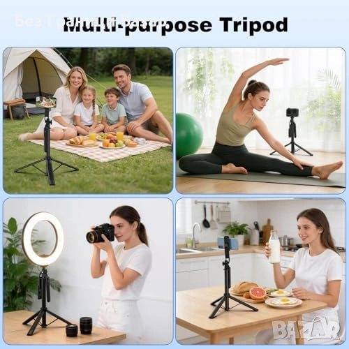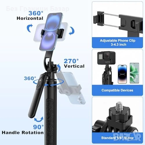 Универсална употреба с 1/4" стандарт – телефон, action камера, камера, ринг лампа; идеален за снимане, стрийминг и пътувания