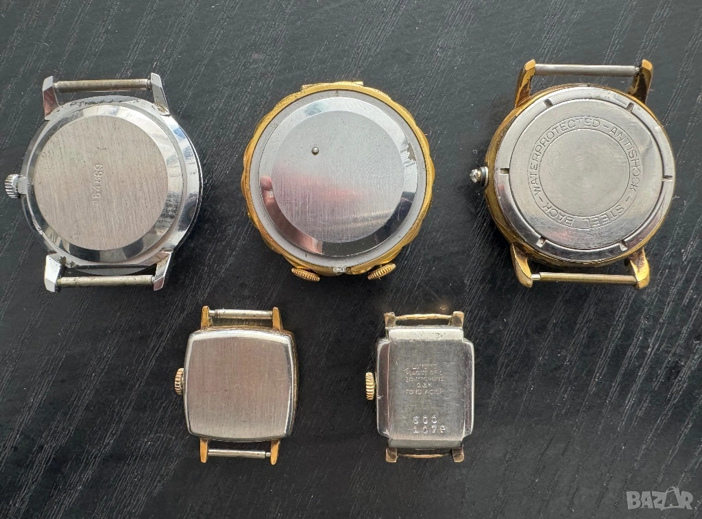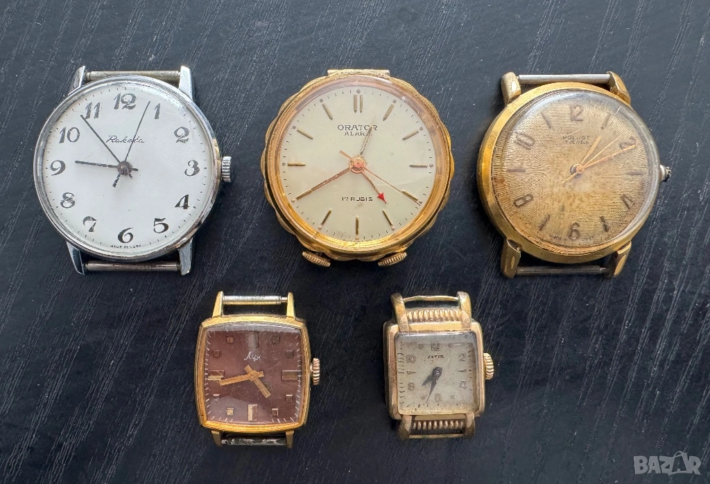 Комплект от 5 броя ретро механични часовници от 50–70-те години. Подходящи за колекционер, часовникар или любител на винтидж модели.