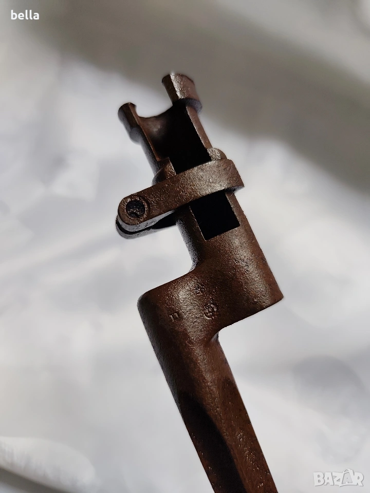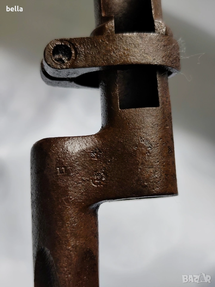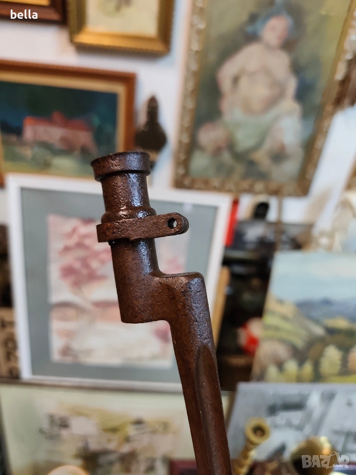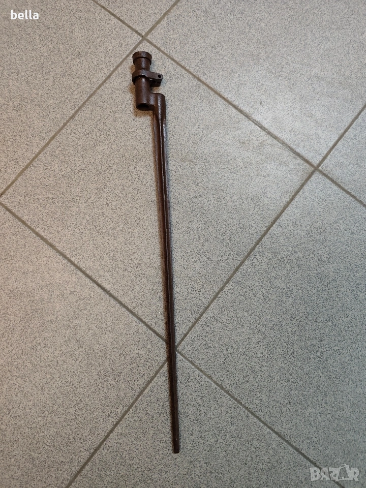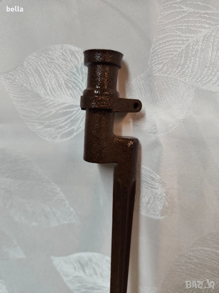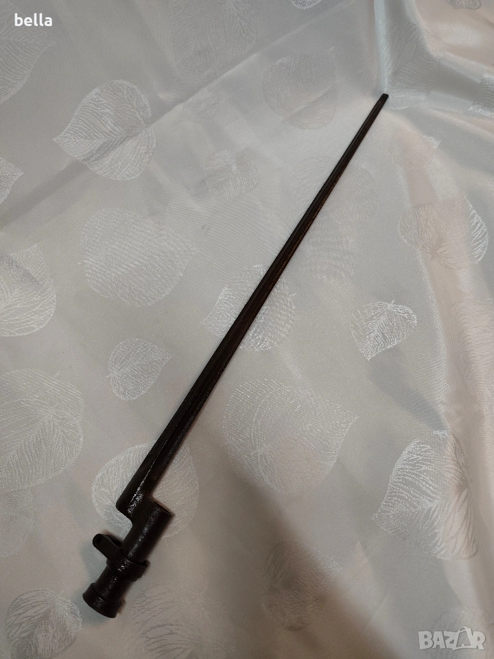 Продавам автентичен руски иглен щик за пушка „Мосин-Наган“. За разлика от масовите по-късни варианти, това е ранният модел с хомут (затягащ пръстен), който е много по-търсен от колекционерите.