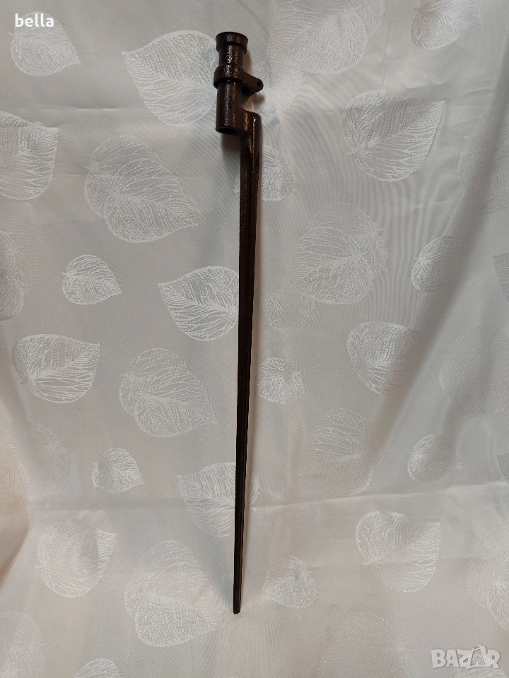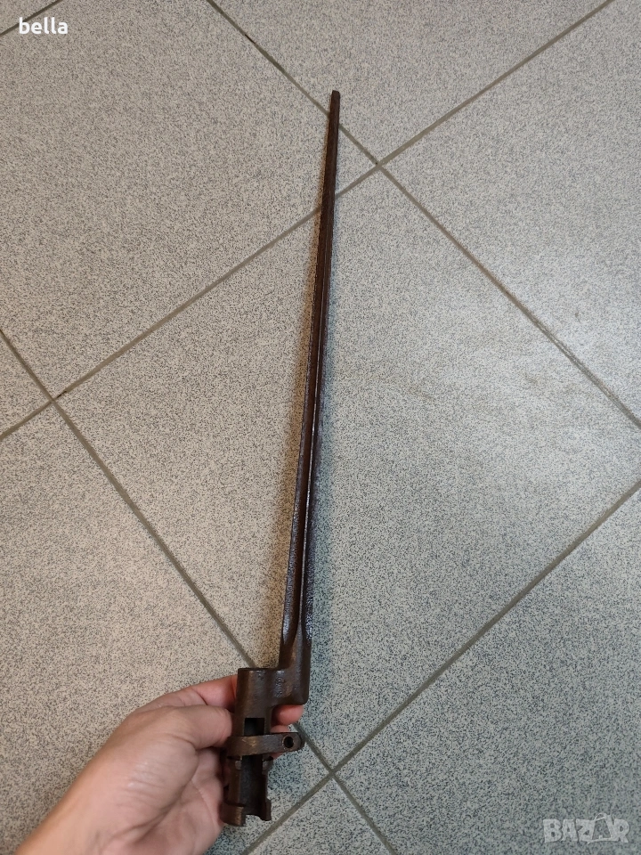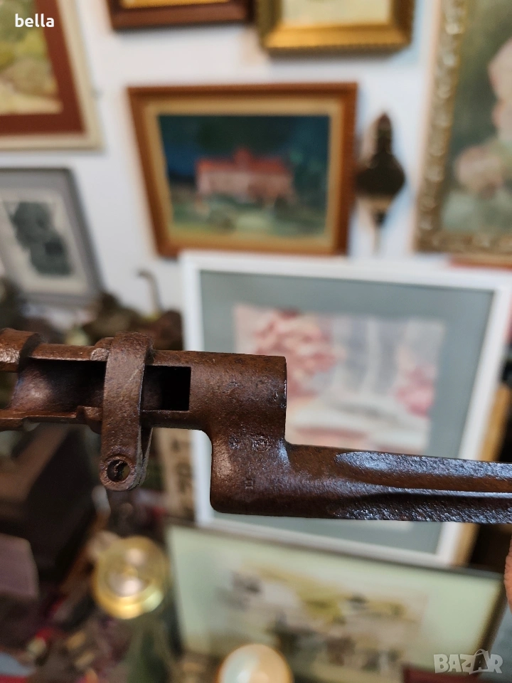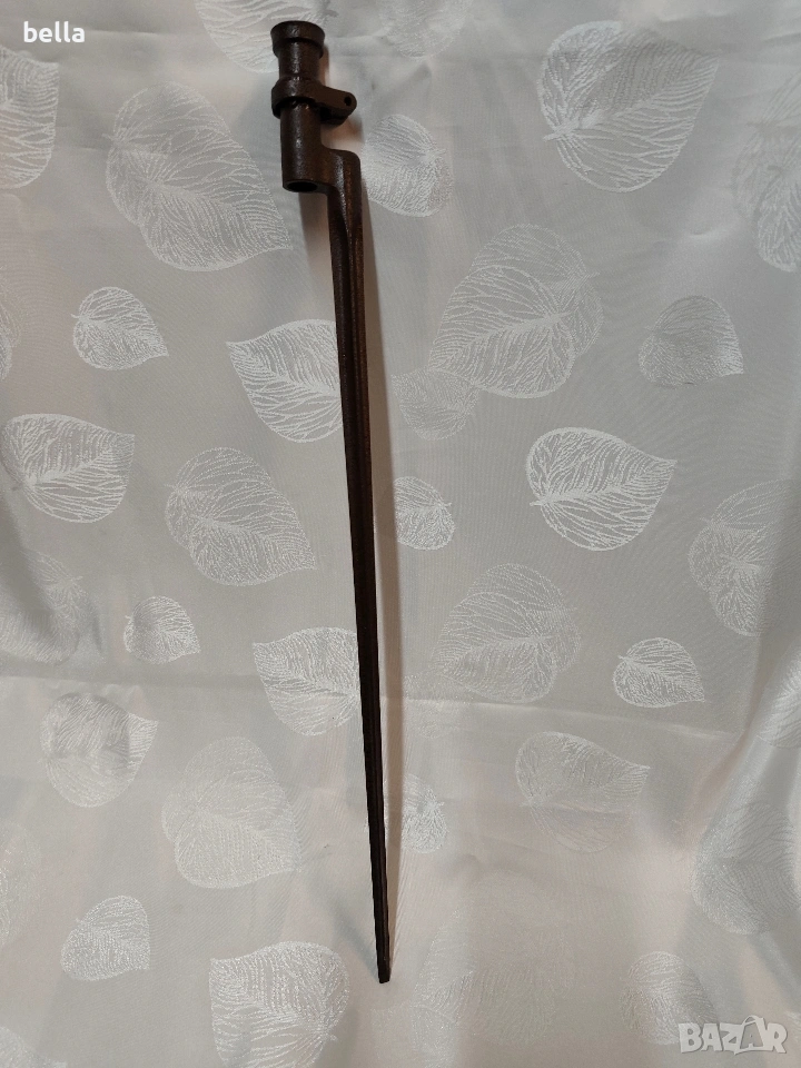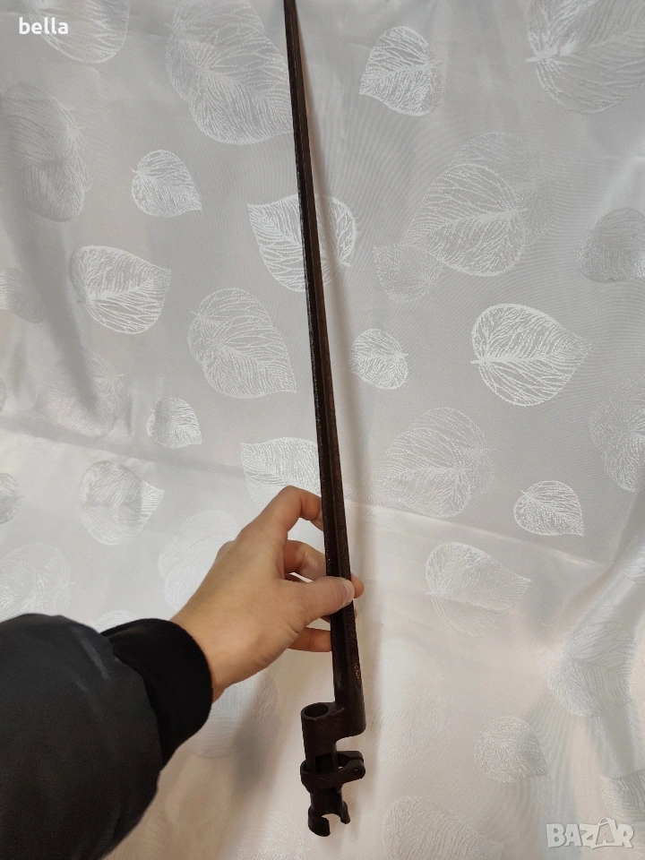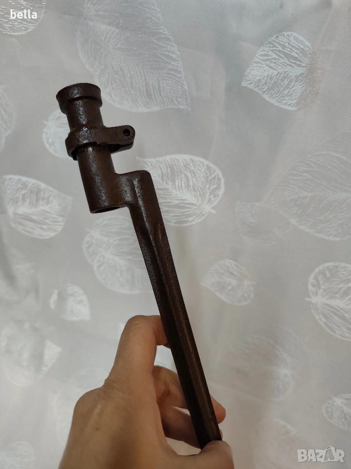 Продавам автентичен руски иглен щик за пушка „Мосин-Наган“. За разлика от масовите по-късни варианти, това е ранният модел с хомут (затягащ пръстен), който е много по-търсен от колекционерите.