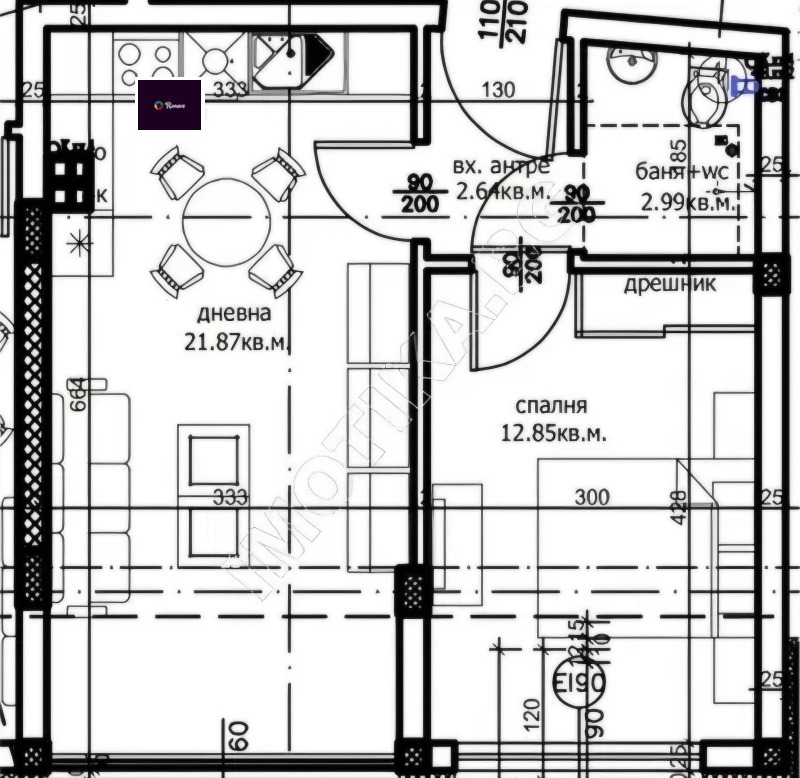 Имотът е с площ от 58 кв.м. и има следното разпределение: входно антре, кухня с трапезария и всекидневна, спалня, баня с тоалетна и тераса.