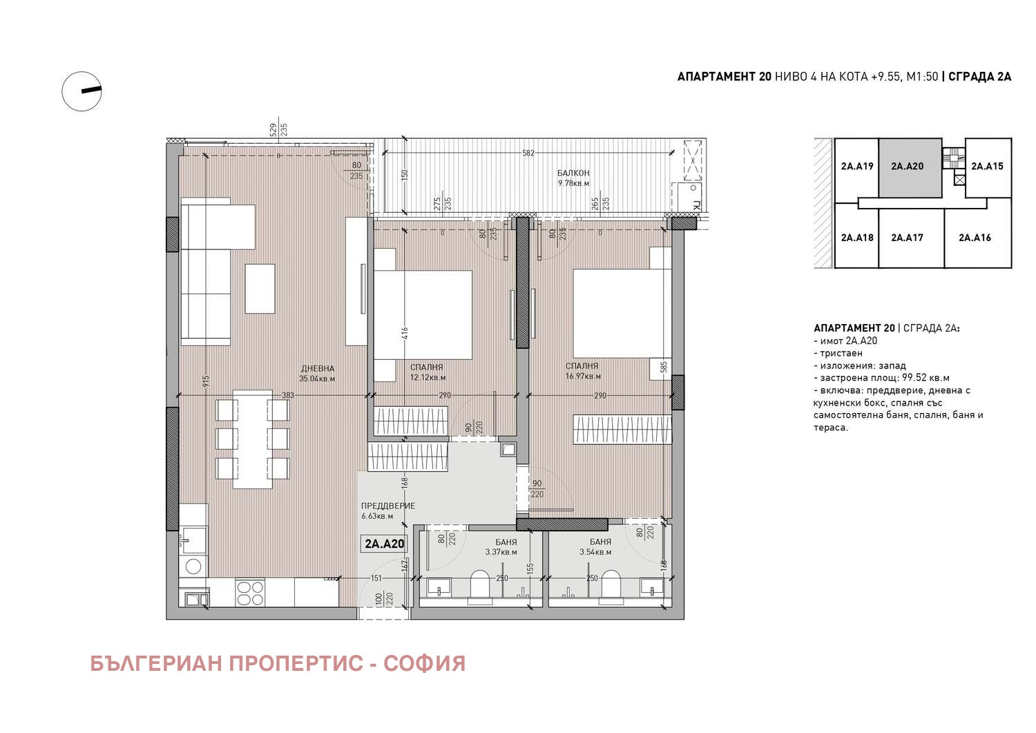 Апартамент 20 , обща площ 118.23 кв.м. (нетна площ 99.52 кв.м. + общи части 18.71 кв.м.).