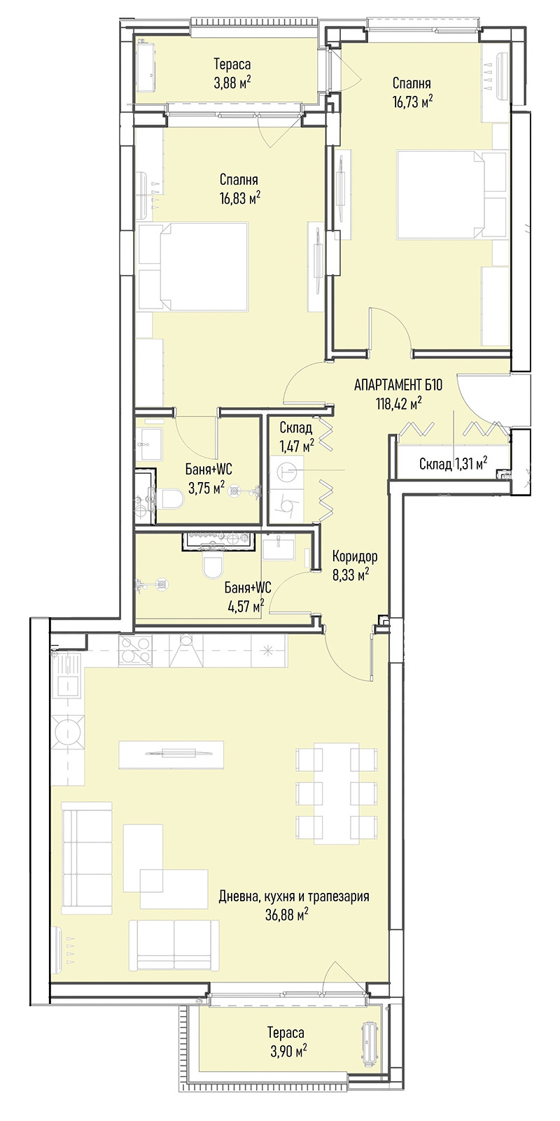 Жилището посочено в офертата е ситуирано на четвърти етаж със застроена площ от 118 кв.м. общи части 29 кв.м.