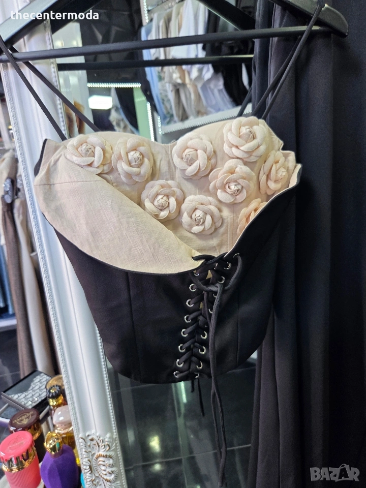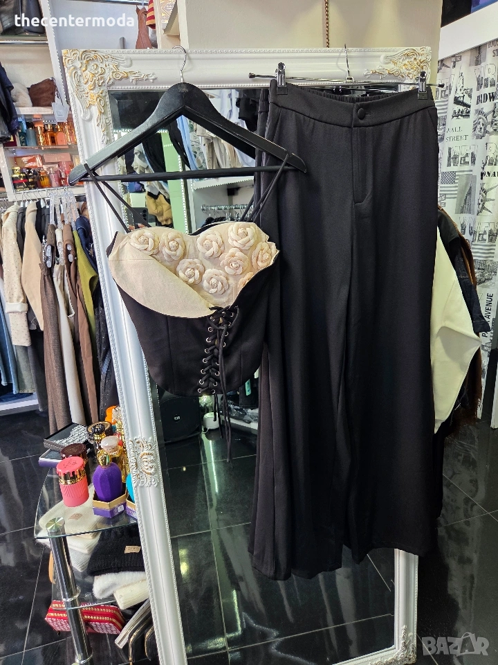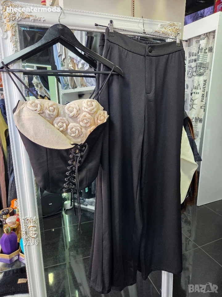 Елегантен сет с корсет от рози и широк панталон.
