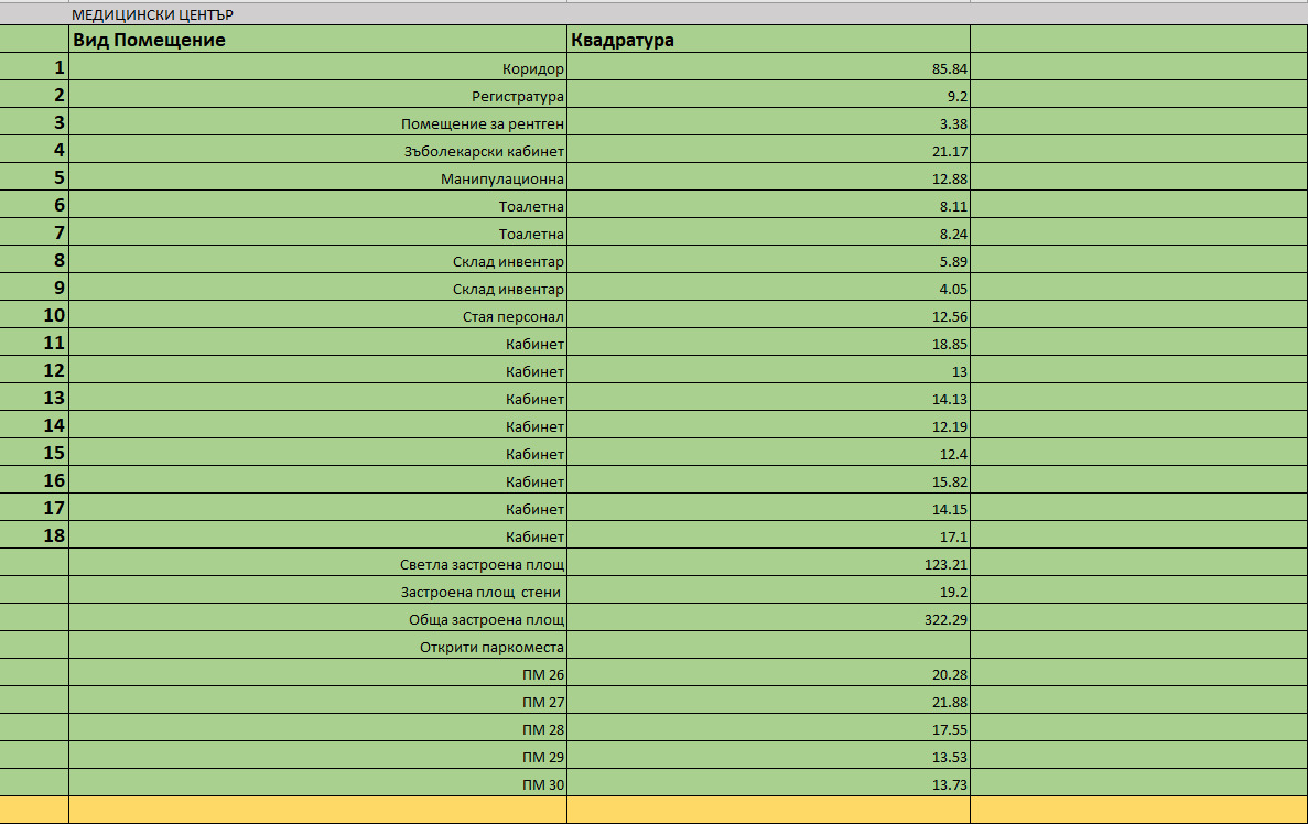 Имотът е със застроена площ от 322,29 кв.м, със самостоятелен вход и е проектиран с функционално разпределение, съобразено с изискванията за медицинска дейност:
