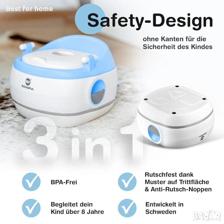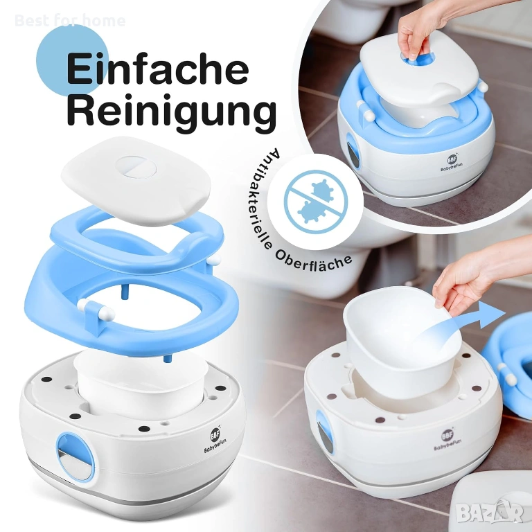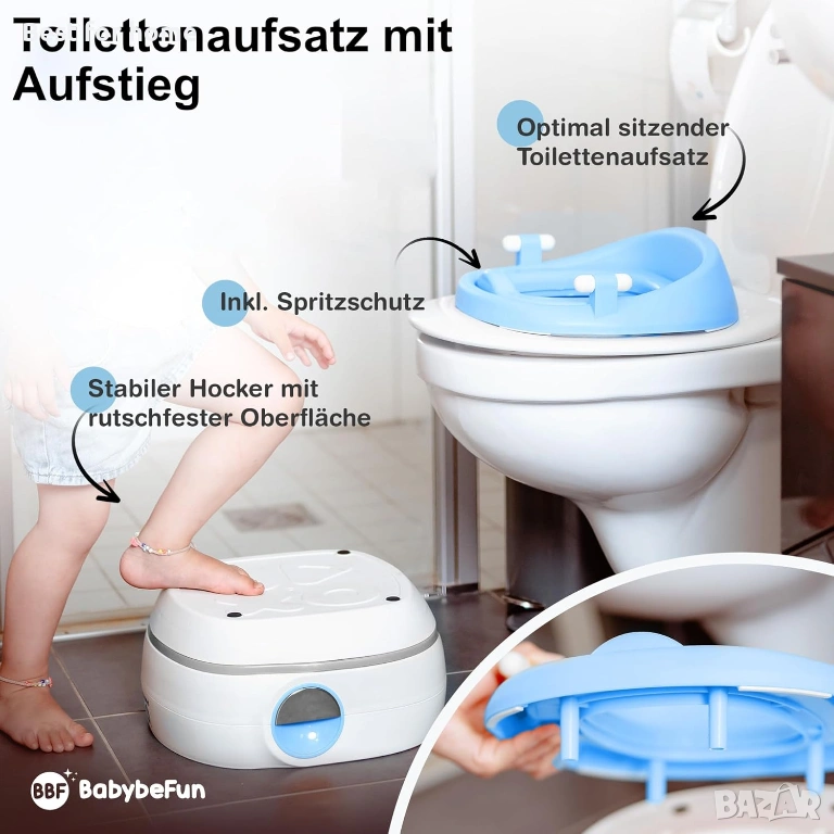 Модерният дизайн без ръбове на нашето гърне BabybeFun се вписва идеално във всяка баня и гарантира, че детето ви се чувства комфортно и безопасно. Това прави приучването към гърне приятно преживяване без стрес или тревожност.