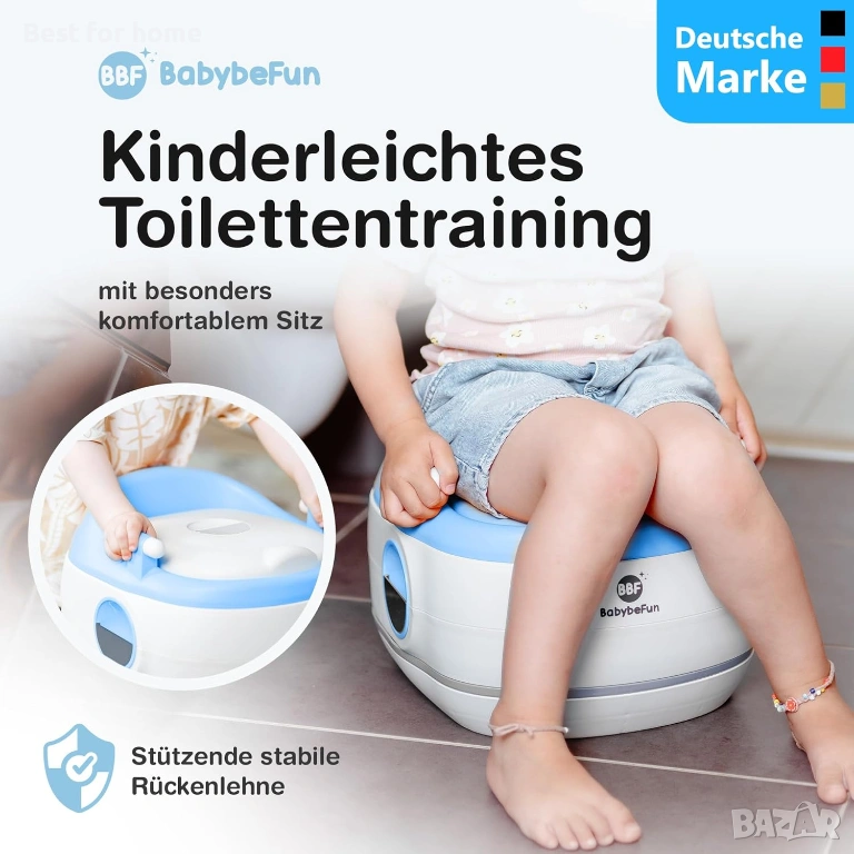 Лесно за почистване: безопасна и удобна употреба с облегалка и дръжки, стабилно благодарение на неплъзгащи се гумени крачета и безопасно стоене на столчето с протектор. Нашето тоалетно гърне BabybeFun за деца - перфектната комбинация от комфорт и безопасност.