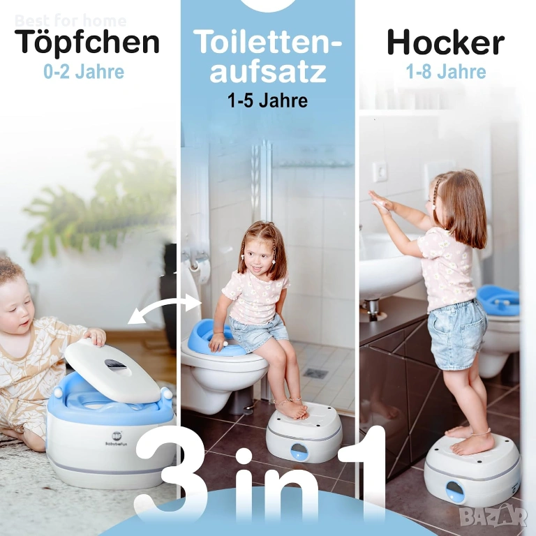 Нуждаете се само от едно с 3-в-1 функция: гърне, тоалетна чиния и столче в едно! Вашето дете научава целия преход към тоалетната само с един продукт. Практично, пестещо място, многофункционално и много по-евтино.