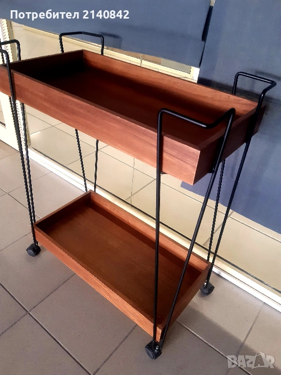 Изработена от орехово дърво с прахово боядисана метална конструкция и колелца.