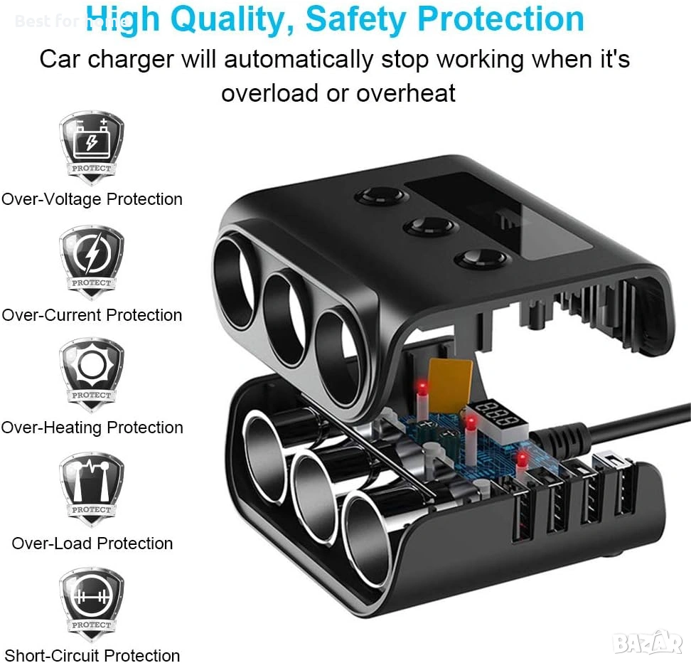 Изходен ток: макс. 3.6A (USB), макс. 2.4 всеки