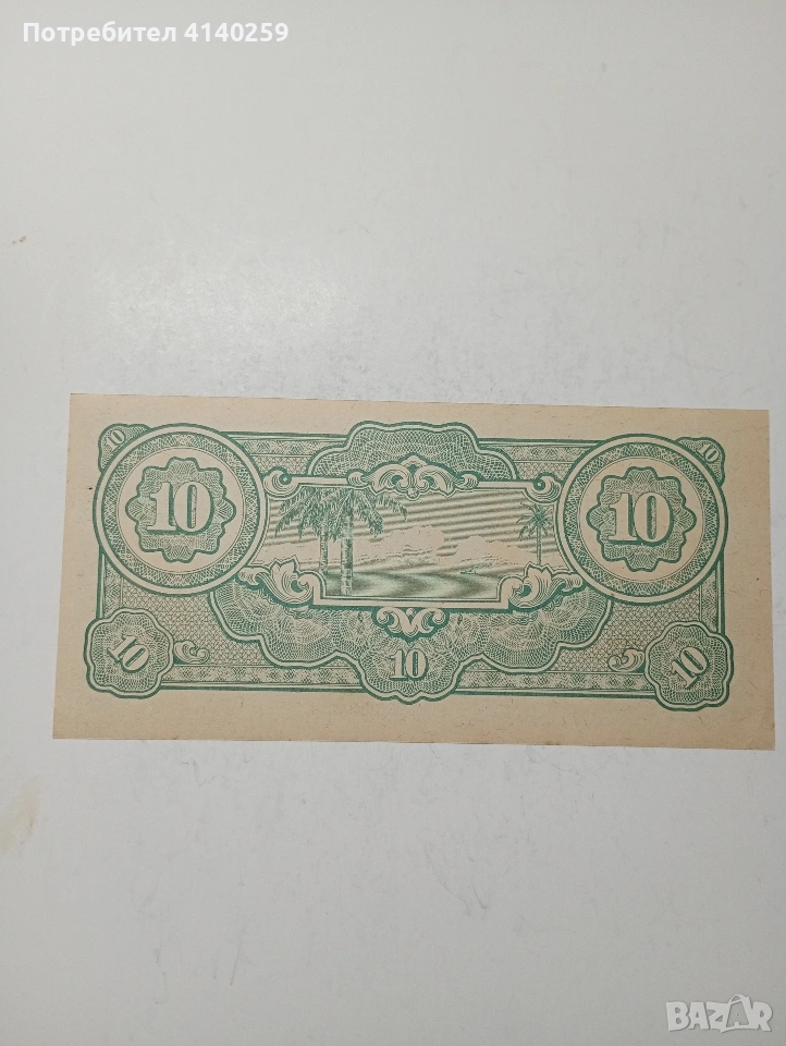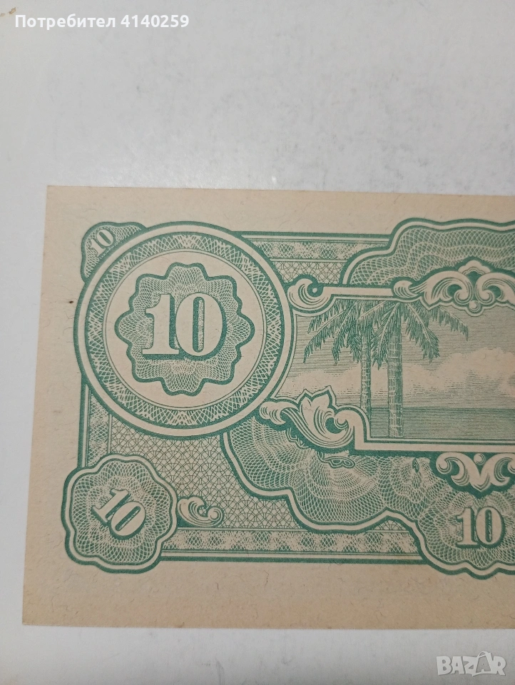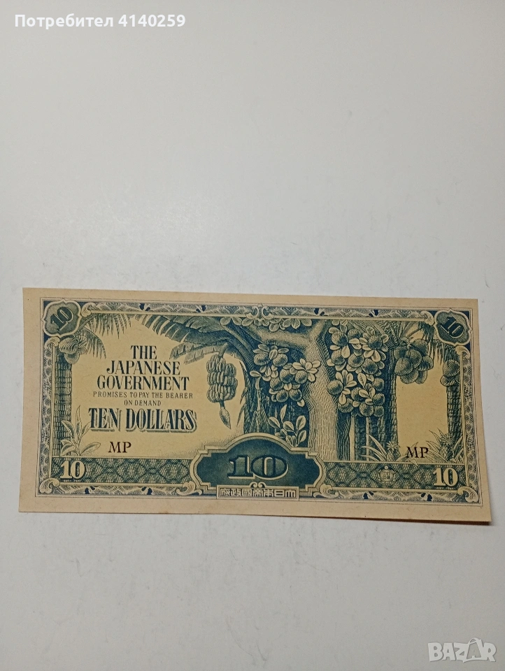 БАНКНОТА ЯПОНСКА ОКУПАЦИЯ ВОЕННА 10 ДОЛАРА МАЛАЯ 1942-1942 Г ( ИЗВЕСНА КАТО БАНАНОВИ ПАРИ ) РЯДКА В КАЧЕСТВОТО СЪСТОЯНИЕ НОВО ПОЛУЧАВАТЕ СНИМАНАТА БАНКНОТА РАЗГЛЕДАЙТЕ ДРУГИТЕ МИ ОБЯВИ ДА КОМБИНИРАТЕ ДОСТАВКА ЕКОНТ ЗА ВАРНА ЛИЧНО