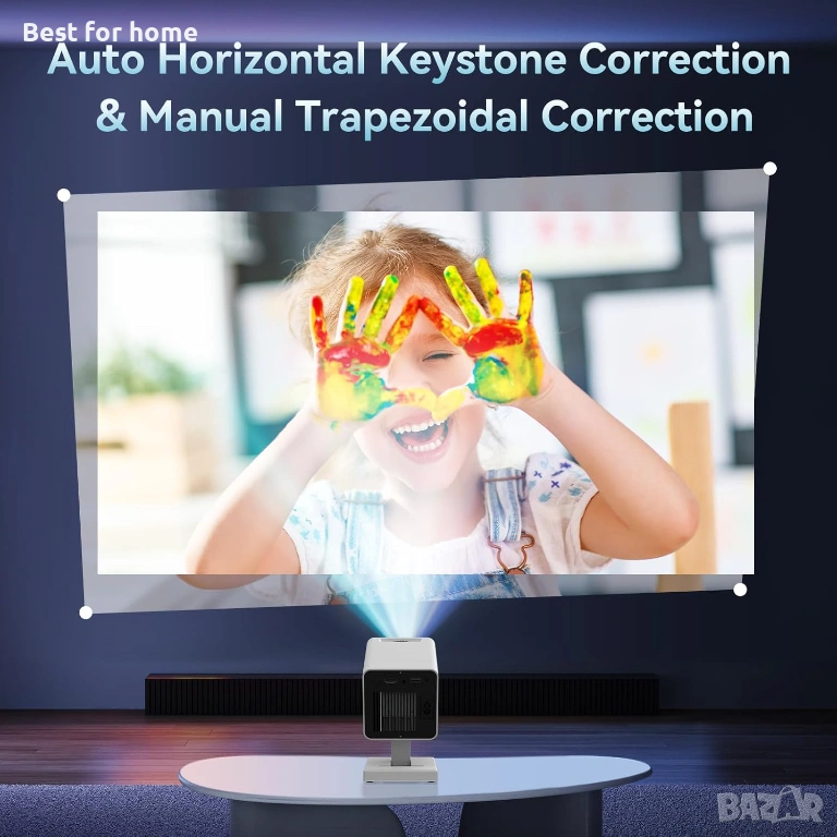 Висококачествено изображение: Този мини проектор поддържа резолюция от 1080P 4K и осигурява ясни и детайлни изображения. Той използва усъвършенствана технология за цветове и поддържа HDR10, HLG и др. Цветовете са живи и реалистични и създават реалистични визуални ефекти. Оптималното разстояние на прожектиране е 1,78 м, а размерът на прожектиране е 152 см. Автоматичната хоризонтална корекция на трапецовидното изкривяване осигурява оптимална позиция на прожектиране.