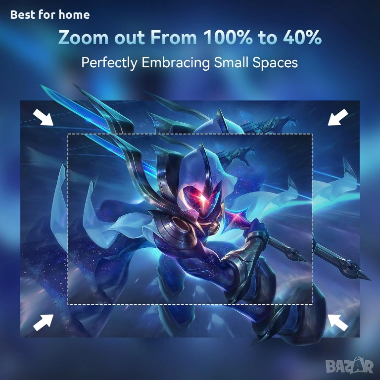 Въртящ се интелигентен проектор: основата на проектора е оборудвана с въртяща се скоба, която позволява проектора да бъде подравнен в различни посоки, например от стената до тавана. Можете да гледате от всякакъв ъгъл между 12 и 36 м, а изображението върху платното е ясно и отчетливо.