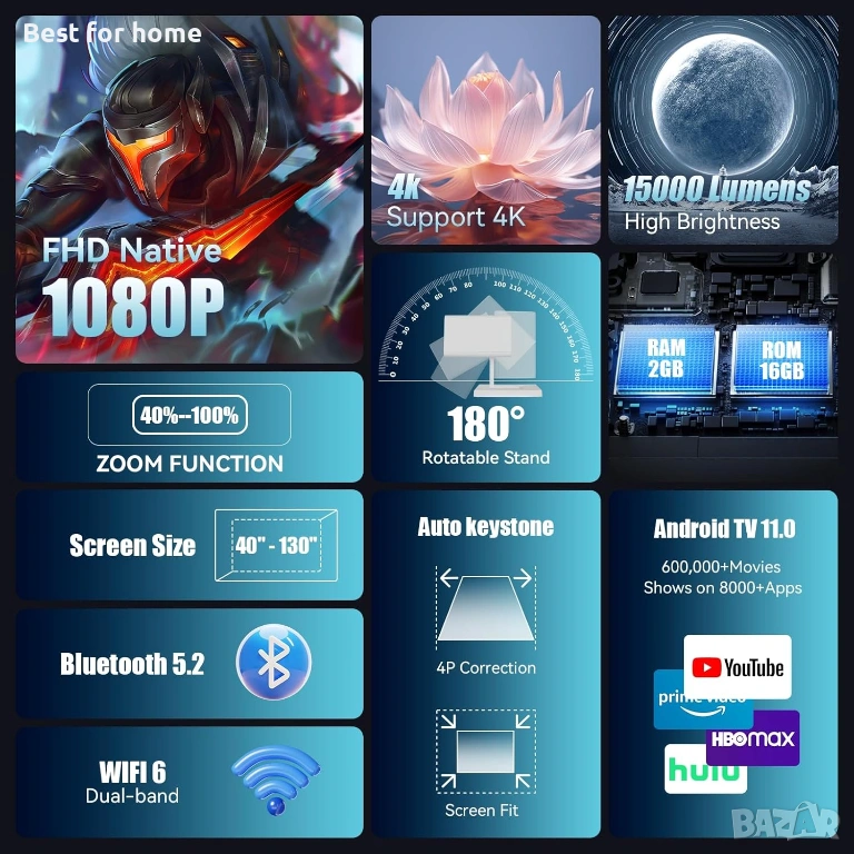 Интелигентен проектор с вградено приложение: Този проектор е оборудван с операционната система Lilac. Потребителският интерфейс е опростен и интуитивен, обединявайки много популярни приложения и ресурси, които можете да търсите само с едно щракване. Лесно изтегляйте любимите си стрийминг приложения като Netflix, YouTube и Prime Video.