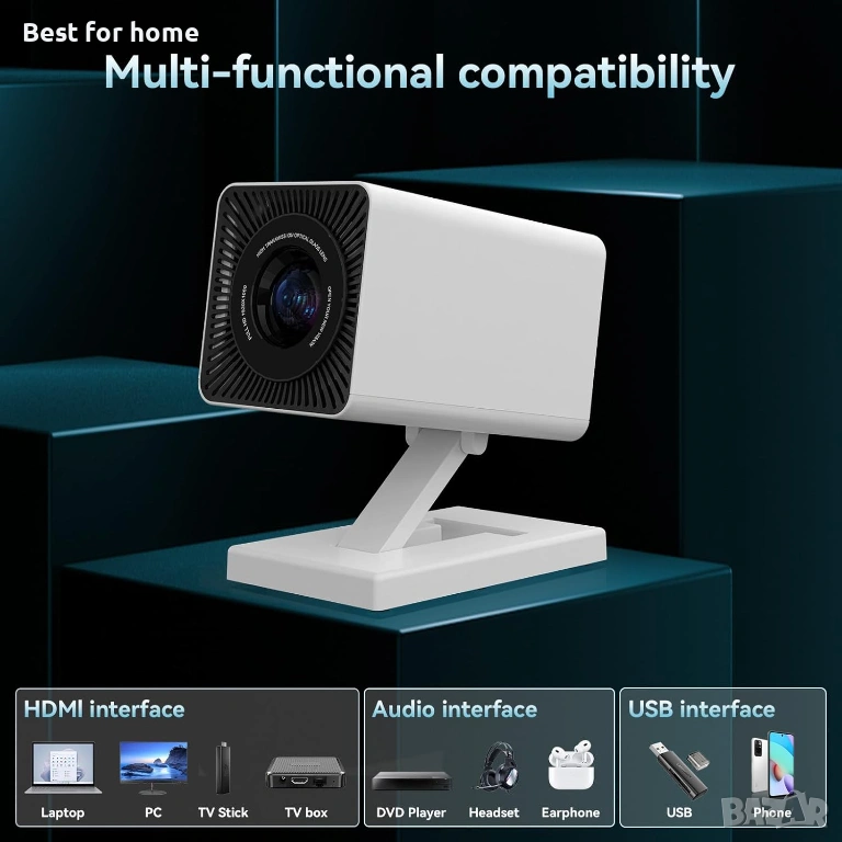 Широко приложение: този преносим проектор има вградени HDMI, USB и 3,5 мм жакове за слушалки (моля, обърнете внимание, че HDMI кабелът трябва да бъде закупен самостоятелно), подходящ за телевизионни приемници/приставки, игрови конзоли, компютри, смартфони, таблети, лаптопи, DVD плейъри, USB устройства и др. Можете да го използвате за различни поводи, като домашно кино, парти, работа и др.