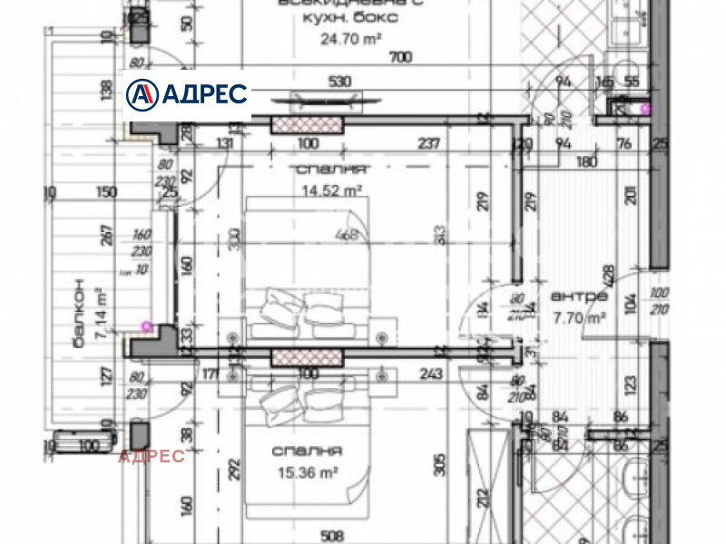 Тристаен апартамент със ЗП- 89,98 кв.м., а с общите части 109,56 кв.м. Разполага с антре, спалня с баня-тоалет и дрешник, спалня, баня с тоалет и балкон