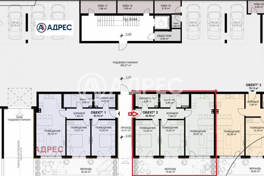 Това жилище е с собствен двор на ниво партер, верандата ще бъде оградена за ползване само от собственика. Изключително просторно и слънчево жилище с усещане за къща. Разпределението по квадрати е както следва жилищна част 101,85+ 19,92 веранда =121,77 м2 общо за апартамента.