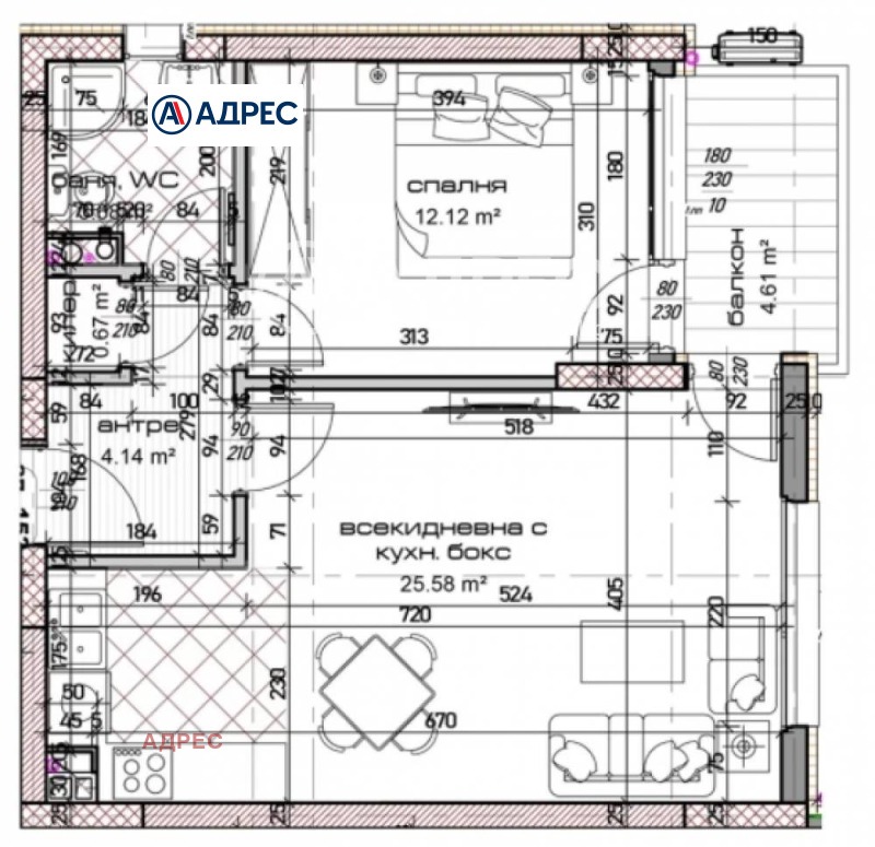 Двустаен апартамент със ЗП- 58.79 кв.м., а с общите части 71.58 кв.м. Разполага с антре, дневна с кухненски бокс, спалня, баня с тоалет, килер и балкон.