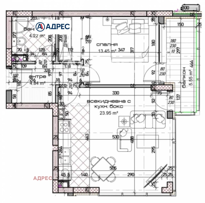 Двустаен апартамент със ЗП- 59,68 кв.м., а с общите части 72,67кв.м. Разполага с антре, дневна с кухненски бокс, спалня с дрешник, баня с тоалет и балкон.