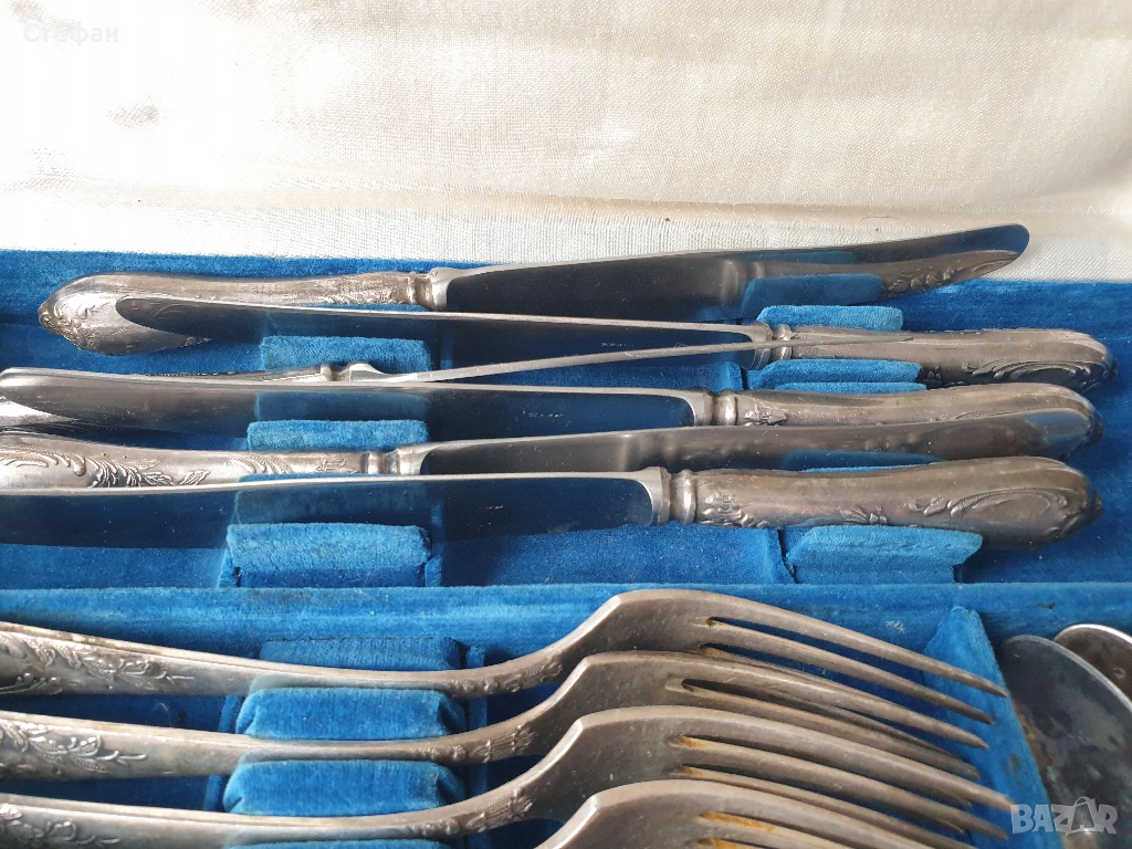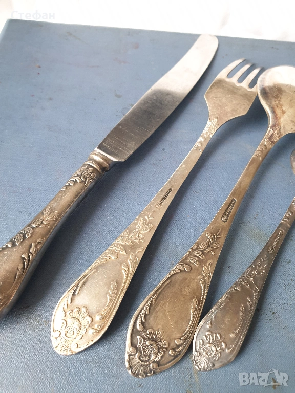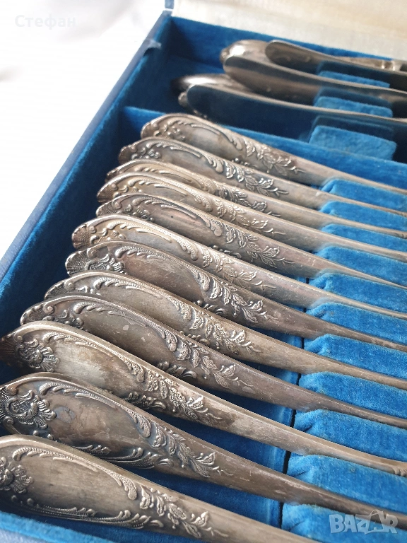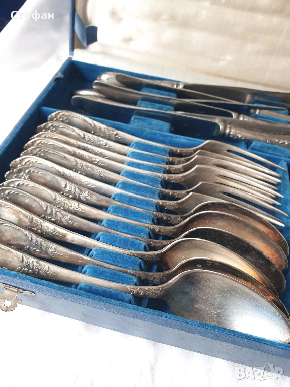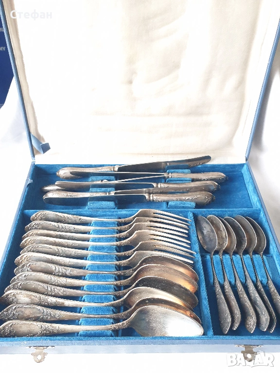 Комплект посребрени прибори от 24 броя в перфектно състояние, произход - СССР, оригинална кутия, маркирани.