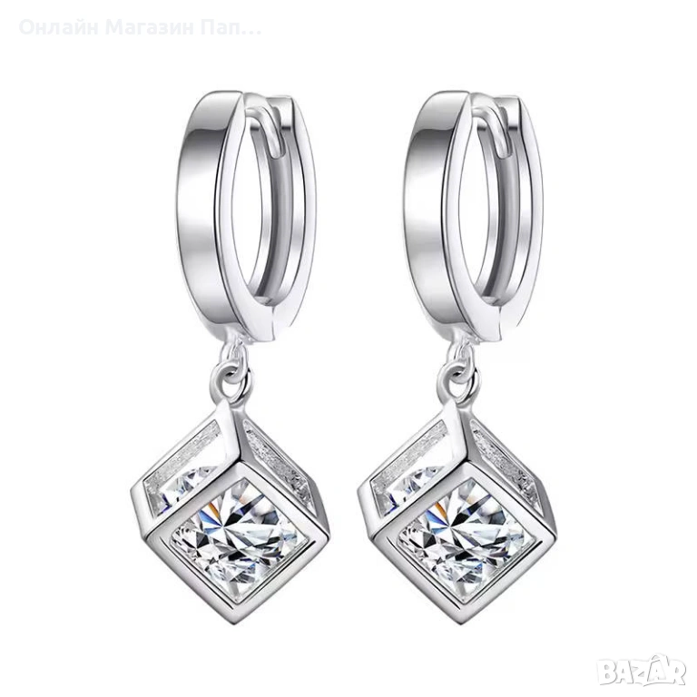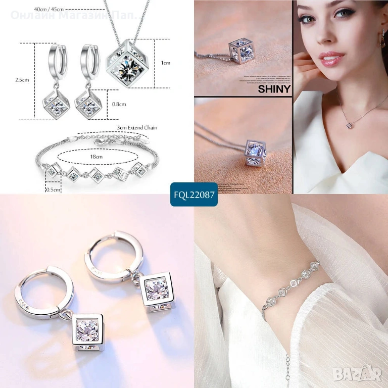 Комплектът включва колие, гривна и висящи обеци, изработени от истинско сребро проба 925, маркирано с печат за автентичност. Дизайнът впечатлява с оригинални кухи кубчета със сребърни ръбове, в които е поставен кристал, създаващ ефект на „плаващ“ камък.