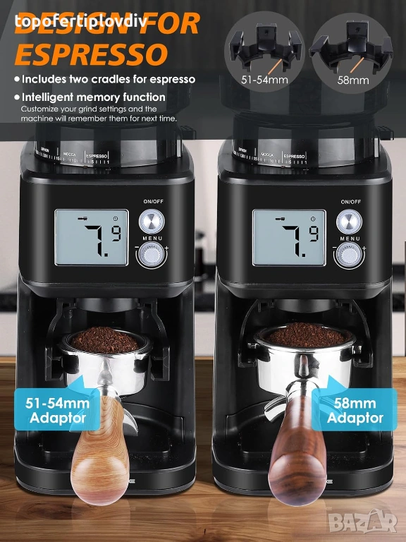 Съвместима с портафилтър за еспресо Предлага се с две скоби: 53 мм държач, съвместим с 51-54 мм държачи за филтри, и 58 мм държач за 58 мм държачи за филтри. Автоматично активиране чрез микропревключвател, смилането се извършва директно в портафилтъра, без отпадъци или замърсявания.