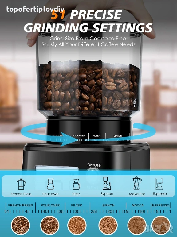 51 регулируеми нива на смиланe Лесно регулирайте фиността на вашето кафе с 51 прецизни нива на смилане. Идеална за еспресо, филтър, френска преса или студено приготвяне - една мелничка за всички ваши методи.