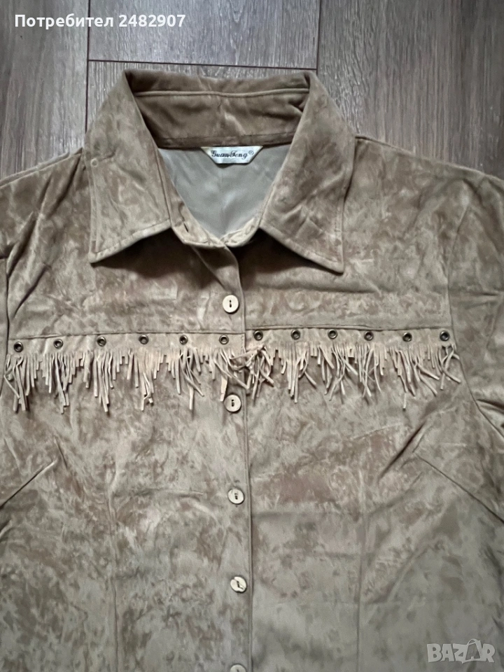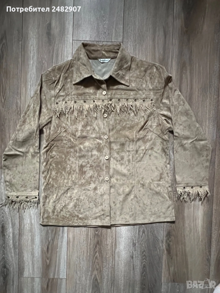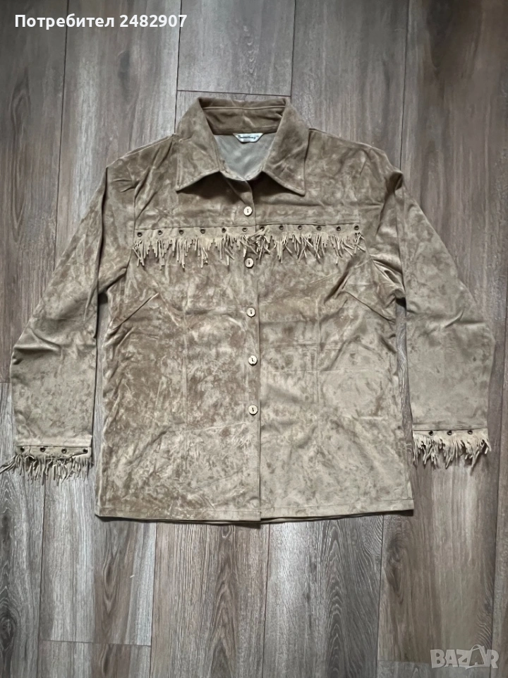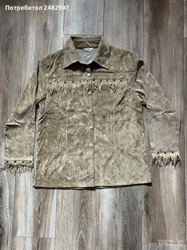 Бежова дамска плюшена риза с ресни, размер М. Съдържа 35 % полиестер и 65 % памук. Ширина в раменете - 44 см, ширина под мишниците - 52 см, ширина в долната част - 54 см, дължина от рамото до долу - 69 см, дължина на ръкава от рамото - 57 см, ширина на ръкава в долната част - 13 см. Чисто нова, не е използвана, с цепки от двете страни, дълги 11 см.