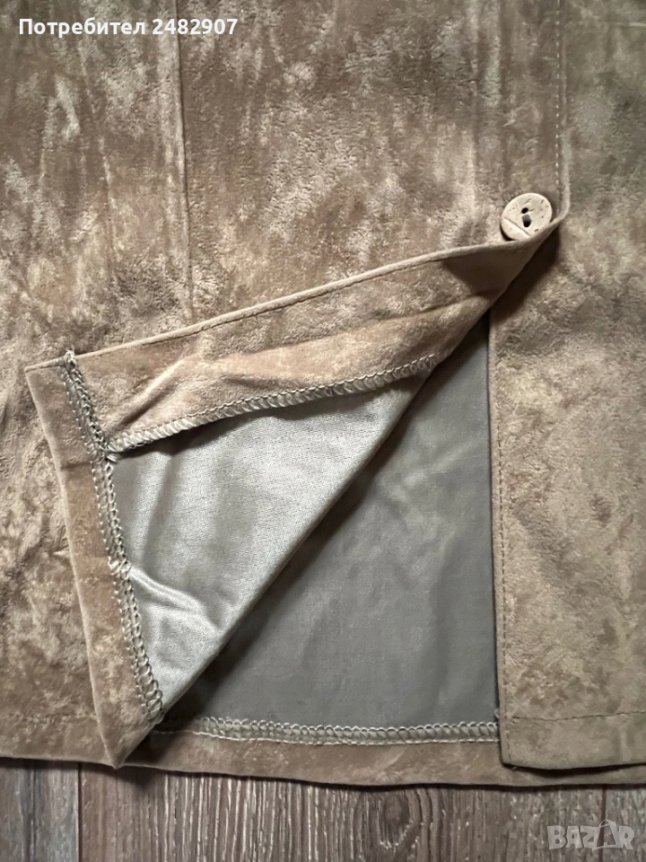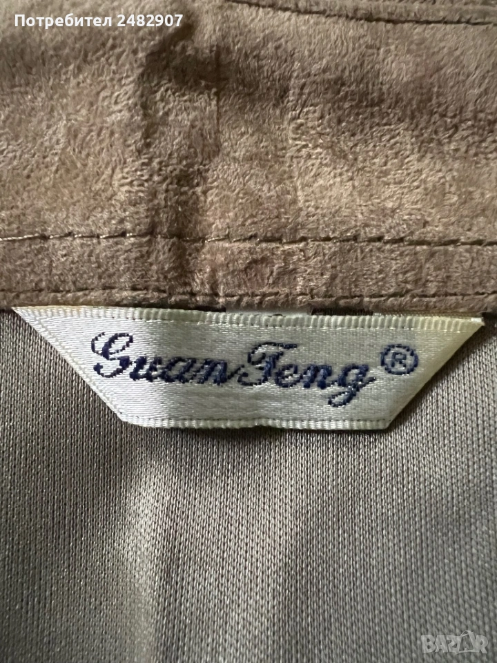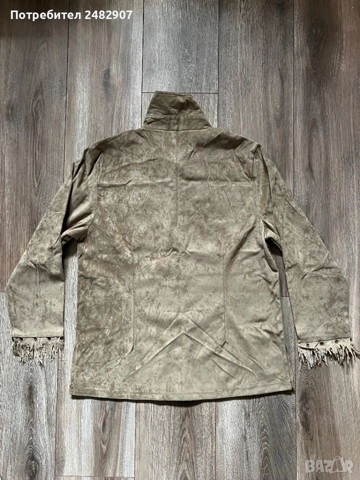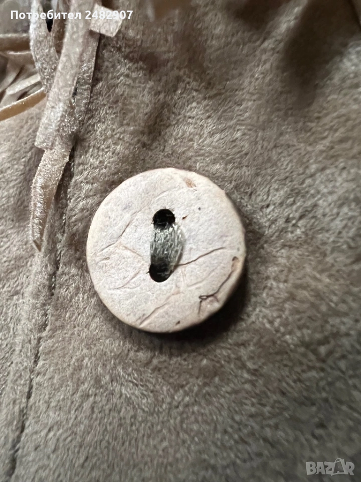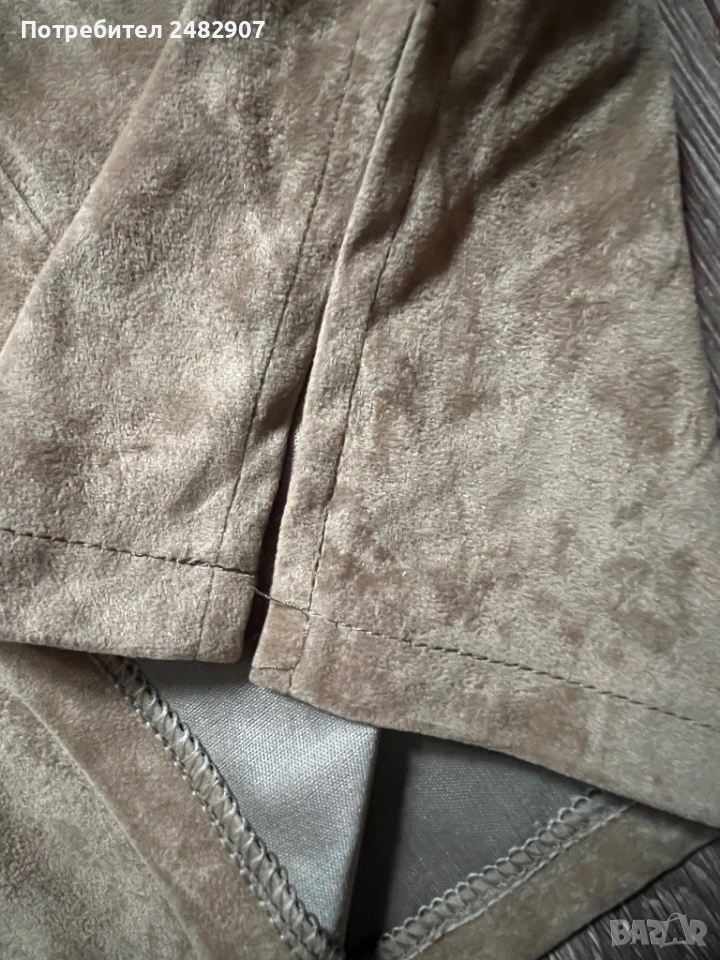 Бежова дамска плюшена риза с ресни, размер М. Съдържа 35 % полиестер и 65 % памук. Ширина в раменете - 44 см, ширина под мишниците - 52 см, ширина в долната част - 54 см, дължина от рамото до долу - 69 см, дължина на ръкава от рамото - 57 см, ширина на ръкава в долната част - 13 см. Чисто нова, не е използвана, с цепки от двете страни, дълги 11 см.