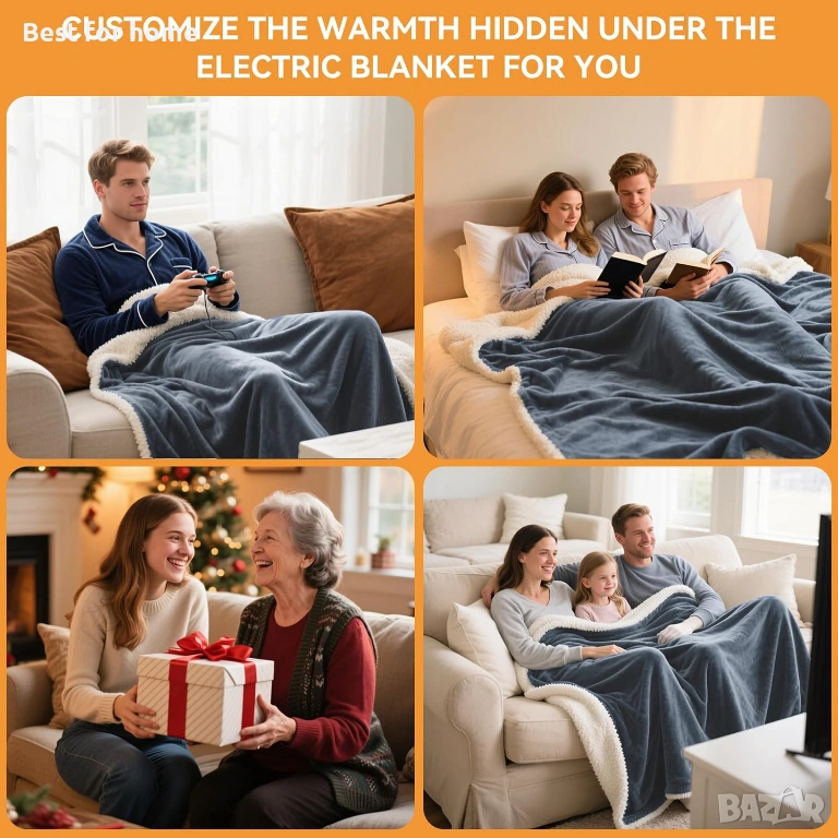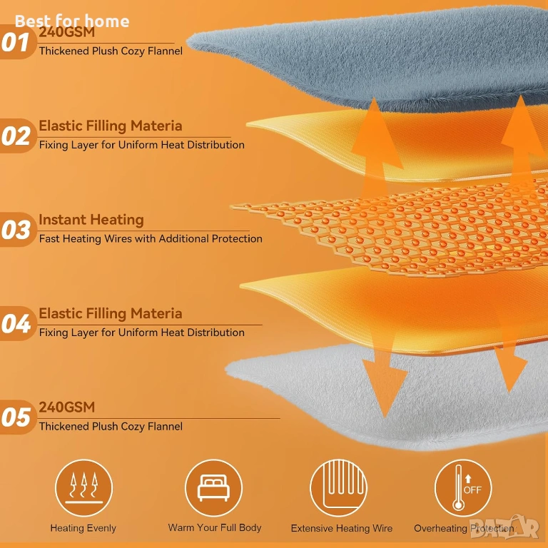 【Меко и топло】Отопляемото одеяло е изработено от супер мек и удобен фланел 240GSM (5 слоя удебелен). Това отопляемо одеяло е с размери 79" x 71" (200x180 см) и е подходящо за двойна или единична употреба. Висококачествените електрически нагревателни проводници са равномерно разпределени вътре в електрическото одеяло и имат фиксиран слой (общо 5 слоя). Предотвратява движението на нагревателните проводници и разпределя топлината равномерно. Осигурява ви топлина и комфорт през нощта, поддържайки тялото ви топло или леглото ви топло преди да заспите.