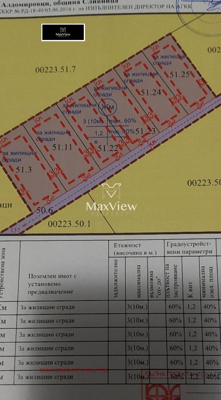 Maxview продава УПИ в с.Алдомировци с правилна форма, подходящ за жилищно строителство, височинна застрояване до 10М. Комуникативно място в бизост до къщи с постоянно живущи. Имота е с площ от 800кв.м. и е част от 6 съседни идентични парцела Теренът е с добър достъп и красива панорамна гледка Лесен достъп до ток,вода! Подходящ е за изграждане на редови еднофамилни къщи! Агенцията съдейства с преференциани условия за своите клиенти при покупка с ипотечен кредит. За повече информация: 0879550164 Марио Димитров