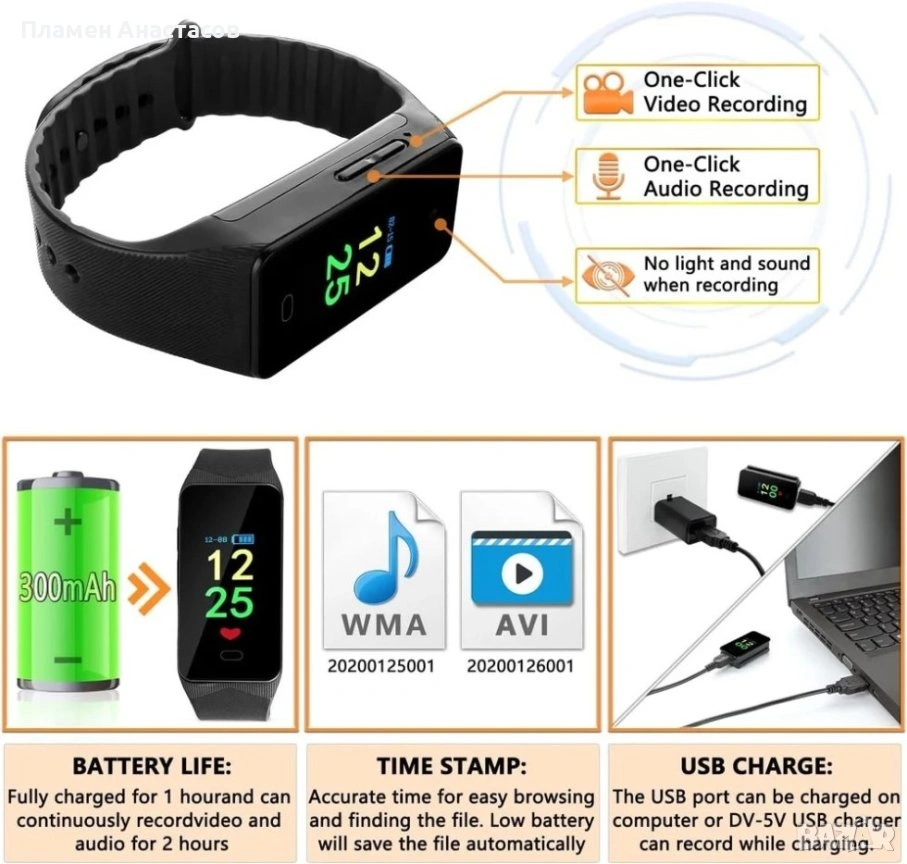 Освен видеозапис, устройството може да работи и като диктофон за аудио запис, което го прави подходящо за различни ситуации – работа, срещи, пътуване или ежедневна употреба.