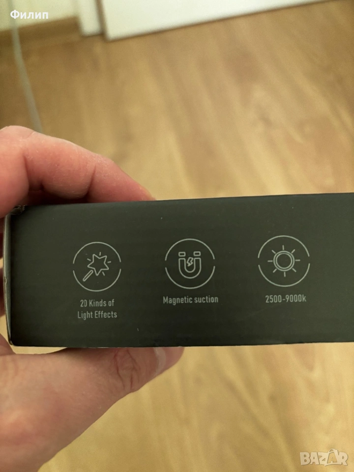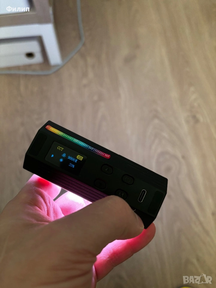 RGB LED светлина на Ulanzi - почти неизползвана. За влогъри и фотографи. С вградена зарядна батерия и различни предварително зададени сцени. Може да се захваща както на метални повърхности заради вградените в лампата магнити, така и стативи/триподи посредством резба. Може да се настройва различни видове бяло от 2500 до 9000 К, както и 360* RGB. На батерия при най-силна осветеност издържа над час.