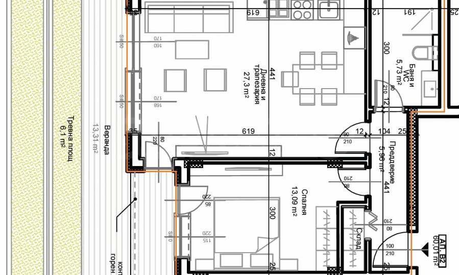 Жилището с обща площ от 7258 кв.м е разположено на 1-ви етаж от 5 и разполага с веранда - 13,31 кв.м и тревна площ - 6,10 кв.м.
