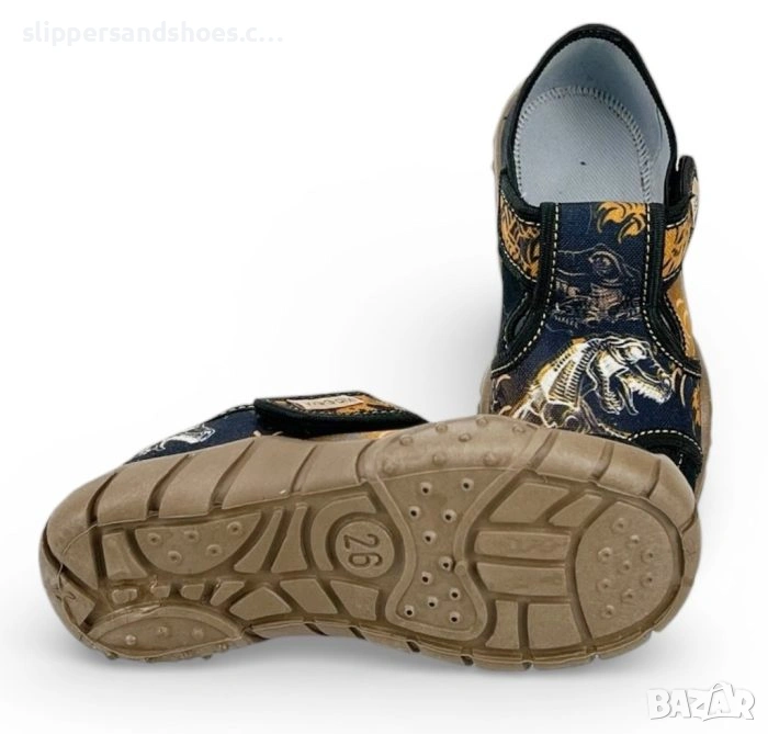 Масивна и гъвкава подметка: Тъмнокафявата подметка е с изразен релеф за по-добро сцепление и е леко повдигната в предната част, за да предпазва пръстите от удари и текстила от протриване.