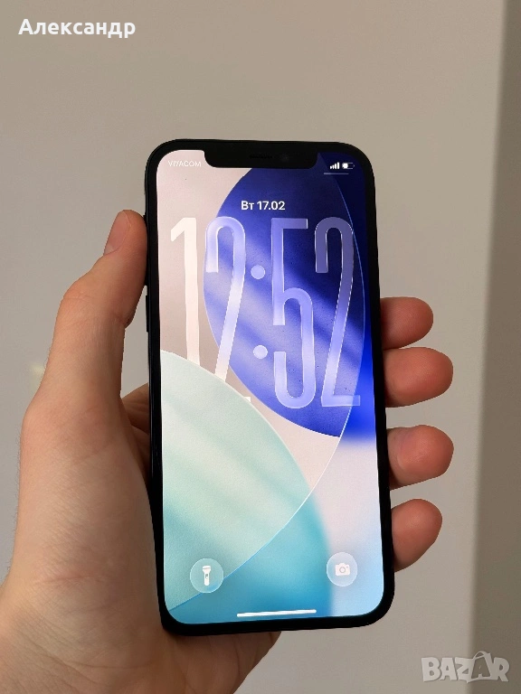 iPhone 12, 64GB в стилен черен цвят. Телефонът е напълно обслужен, почистен и готов за новия си собственик.
