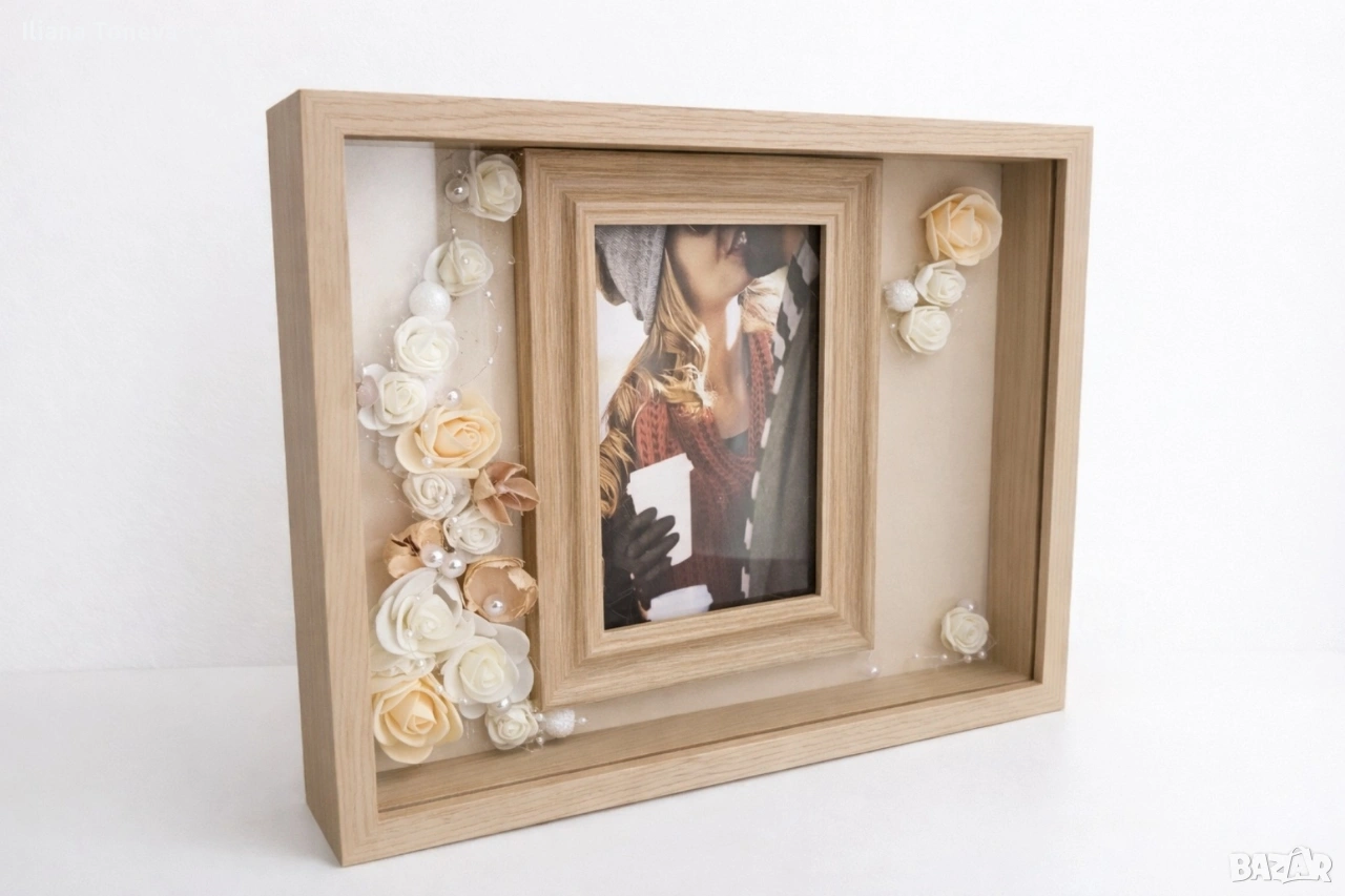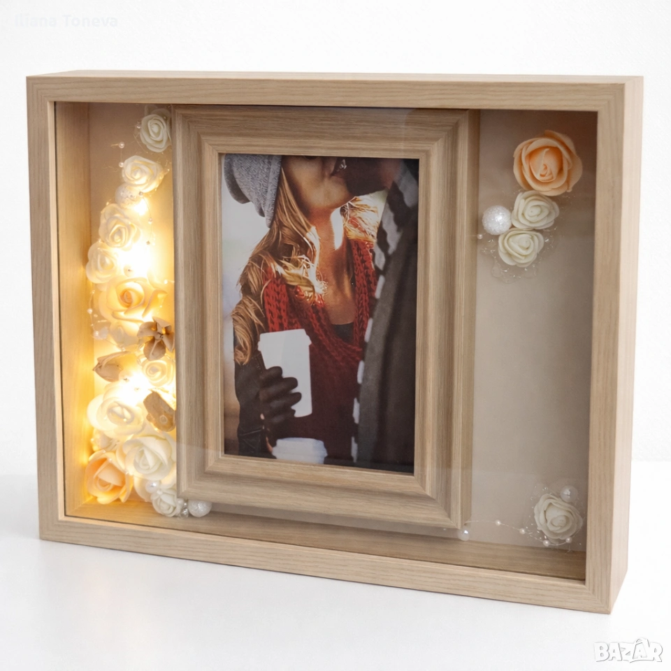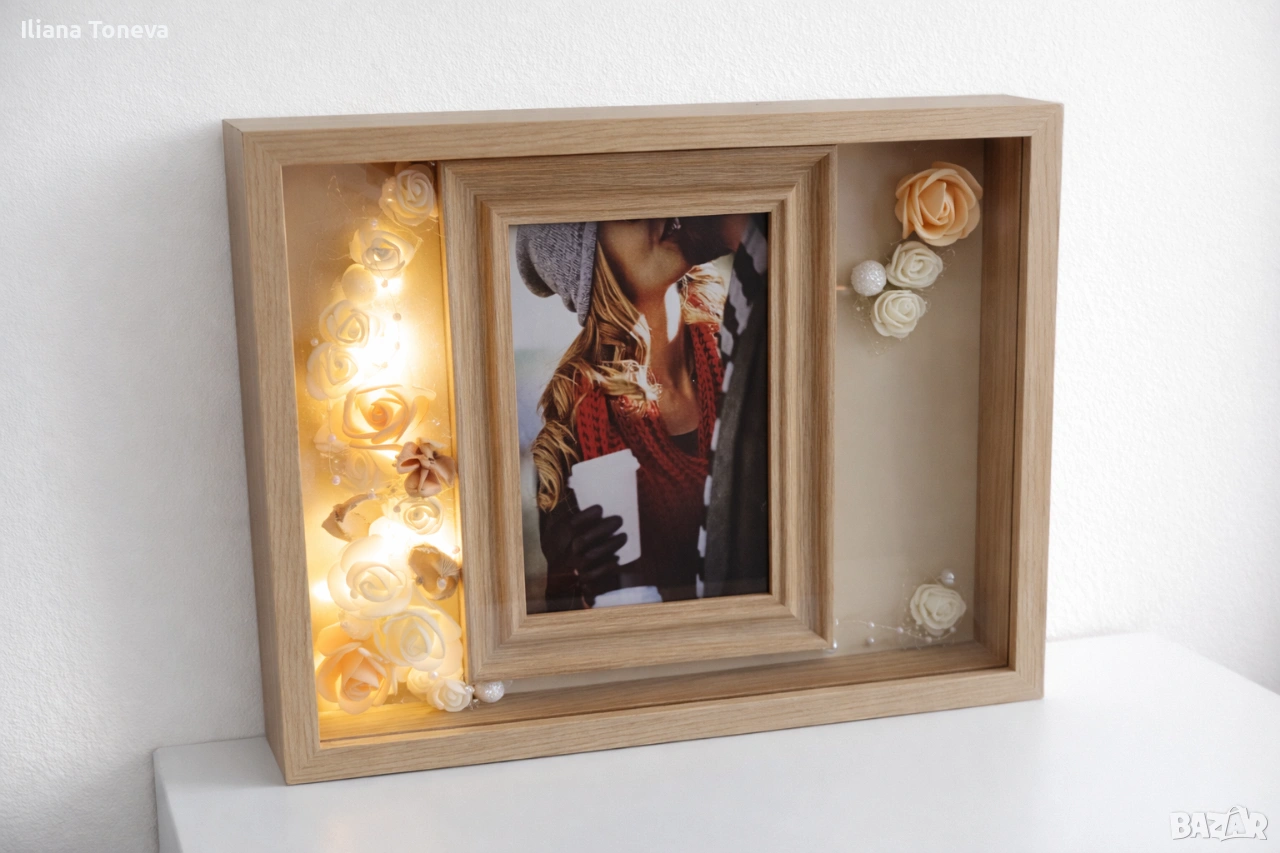 Тази бежова декоративна рамка е с LED светлини и красиви цветя – идеална за:
