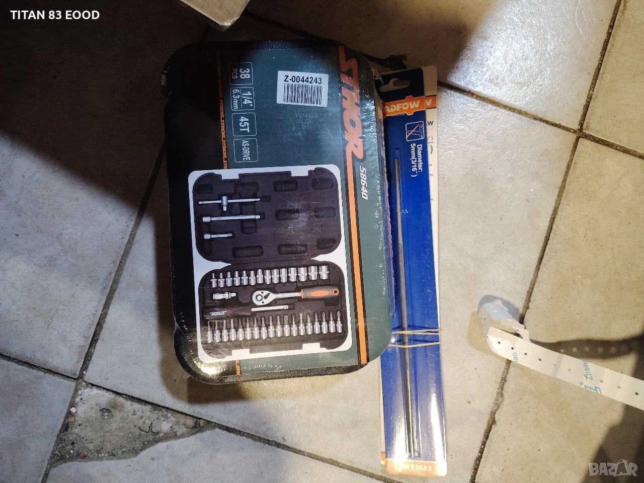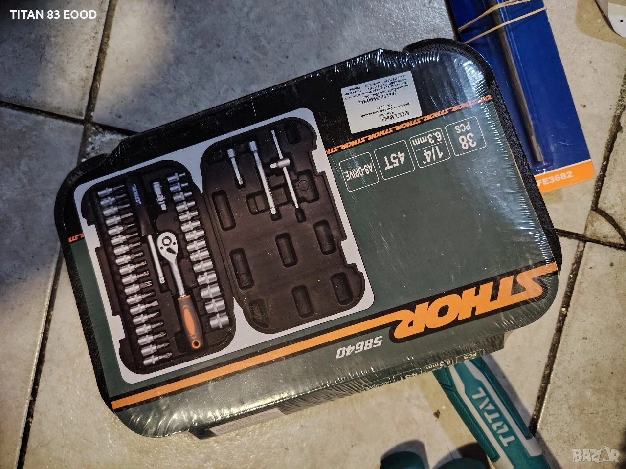 Комплектът инструменти STHOR се състои от 38 елемента в удобен пластмасов куфар. Инструментите са прецизно изработени от материали, гарантиращи тяхната надеждност. Комплектът включва пълен набор от 1/4 "вложки, битове, удължители, карданно съединение и тресчотка с 45 зъба. Практичен комплект с отлично съотношение цена / качество.
