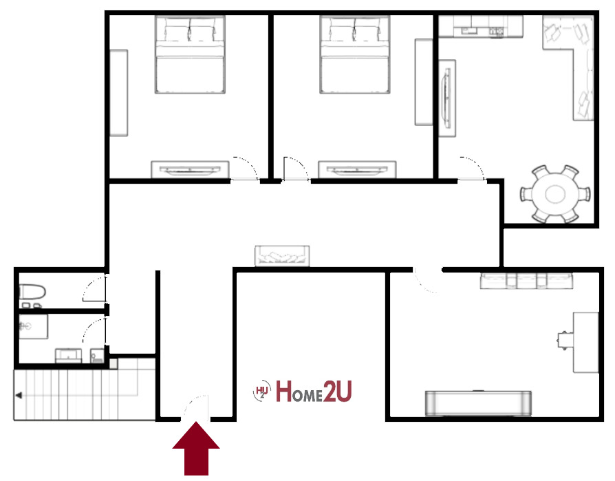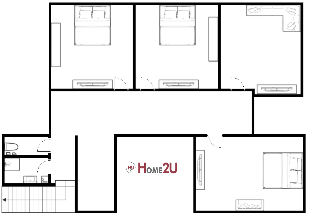 Първи етаж: антре, хол, две спални, кабинет, мокро помещение, баня и отделна тоалетна.
