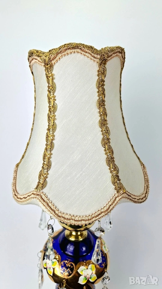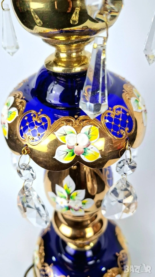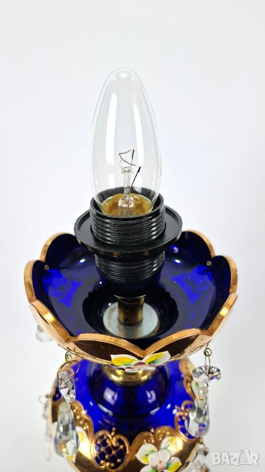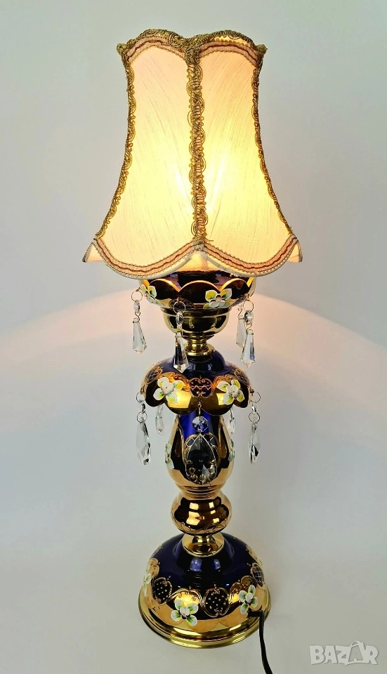Бохемска настолна лампа от кобалтово синьо стъкло с богата позлата и ръчно рисувани флорални мотиви. Декорирана с кристални висулки и текстилен абажур.