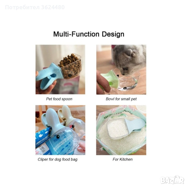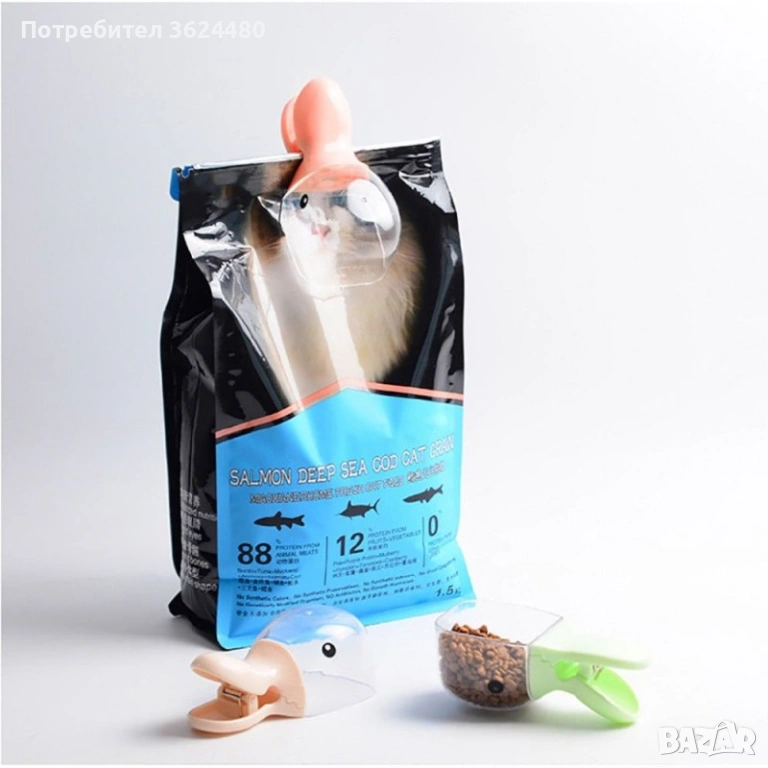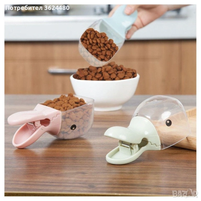 Функционална лъжица за дозиране на котешка и кучешка храна със защипващ механизъм за затваряне на плика