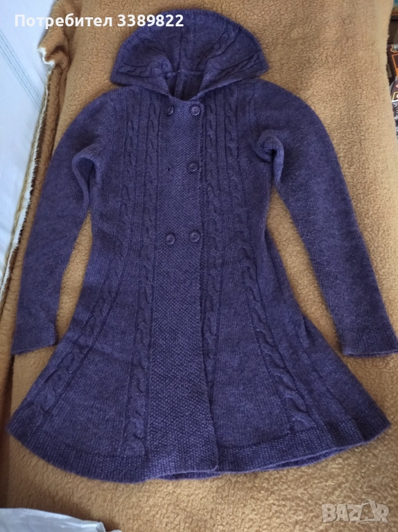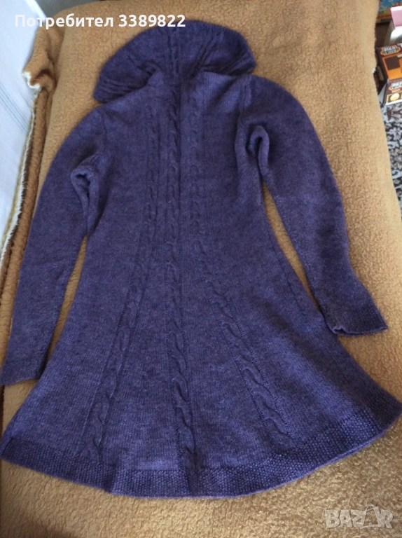 Дамска жилетка - т. лилав цвят, има яка, дължината от рамото до долу 95см, дължина на ръкава 71см, гръдна обиколка едностранно 50см, размер L.