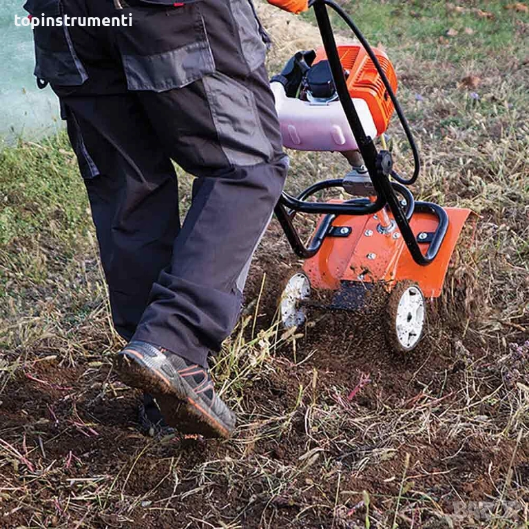 Практичен и компактен модел бензинова мини мотофреза, благодарение на която си улеснявате трудния процес на фрезоване, свързан с боравене на големи машини и много сила при третирането на почвата. С тази машина лесно и ефективно може да фрезовате посредством мотора с мощност от 3 конски сили. Мотофрезата също лесно се разглобява до такова положение, че да може да се събере в багажник на автомобил. Двутактовия двигател с мощност от 52 кубика, с въздушно охлаждане. Разглобяеми дръжки за по-лесен транспорт и съхранение. Машината предлага оптимална дълбочина на фрезоване 11 см, както и ширина на работната част от 33 см. Ергономичният и компактен дизайн на мини фрезата и специално проектираните колела за по-лесна работа гарантират висока ефективност.